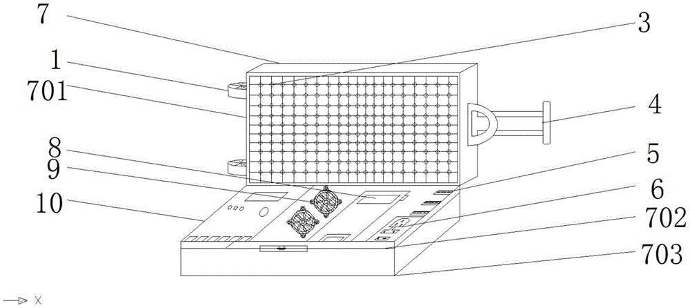 本实用新型公开了一种便携式太阳能储能电源,包括箱体、首层、夹层、底层和蓄电池;所述箱体的底部通过螺栓安装有万向轮,所述箱体的外壁固定有伸缩杆,所述首层的内部安装有太阳能发电板,所述夹层的表面安装有太阳能控制器,所述夹层的表面通过螺栓安装有散热风扇,且散热风扇位于太阳能控制器的一侧,所述夹层的表面安装有充电宝,且充电宝位于散热风扇的一侧,所述夹层的表面安装有电源插座,且电源插座位于充电宝的一侧,所述夹层的表面安装有USB接口组,且USB接口组位于电源插座的上方,所述底层的内部安装有温度感应器,所述蓄电池通过螺栓安装在底层的内部,且蓄电池位于温度感应器的一侧。