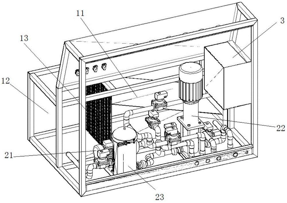 本实用新型公开了尿素上料溶解系统,包括装置外壳,所述装置外壳包括前腔体和后腔体,所述前腔体内的两侧分别设置有尿素加料箱和过滤箱,且通过过滤网分隔,所述后腔体内安装有卧式离心泵、立式离心泵和微米过滤器,所述卧式离心泵分别连接纯水箱连接孔、尿素加料箱和中间水箱第一连接孔,所述立式离心泵分别连接尿素加料箱、中间水箱第二连接孔、微米过滤器和成品箱连接孔,所述微米过滤器分别连接立式离心泵和过滤箱,通过改为一体化制造的方式,无需螺旋上料机及搅拌机,只需将尿素加入加料箱,将设备投入自动模式,通过设计的内循环系统来注水溶解尿素,无需搅拌,增加微米过滤器,进一步过滤成品尿素溶液中杂质颗粒物,使尿素溶液更纯。