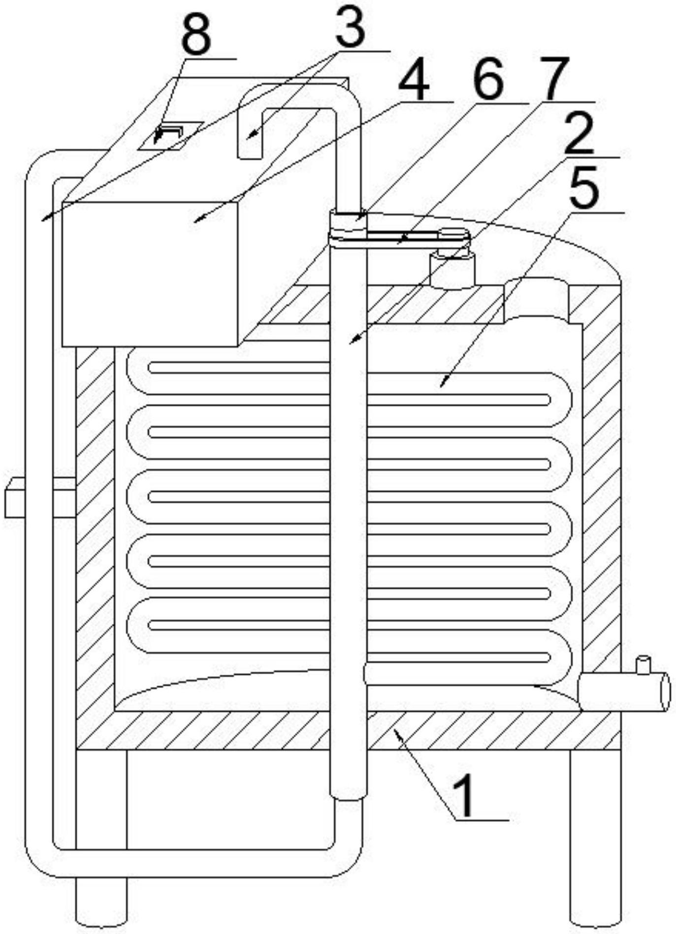 本实用新型公开了一种车用尿素无区加热机构,包括筒体,筒体的顶端开设有置入槽,且筒体的底端一侧插接有排出管,排出管设置有阀门,筒体转动连接有转动杆,转动杆顶底两端均设置有导管,筒体的顶端固定连接有供热箱,两个导管远离转动杆的一端均插入供热箱,转动杆的顶底两端均中空设置,且转动杆设置有换热管道,换热管道的两端分别插接在转动杆的顶底两端中空处,且换热管道呈环绕状,转动杆靠近导管处通过磁流体密封件与导管连接,筒体的顶端固定连接有电机,电机的输出轴通过传动带与转动杆传动连接,通过上述结构的配合,使得可以对筒体内部的各个区域都能进行散热,以便可以对筒体内的车用尿素加热均匀。