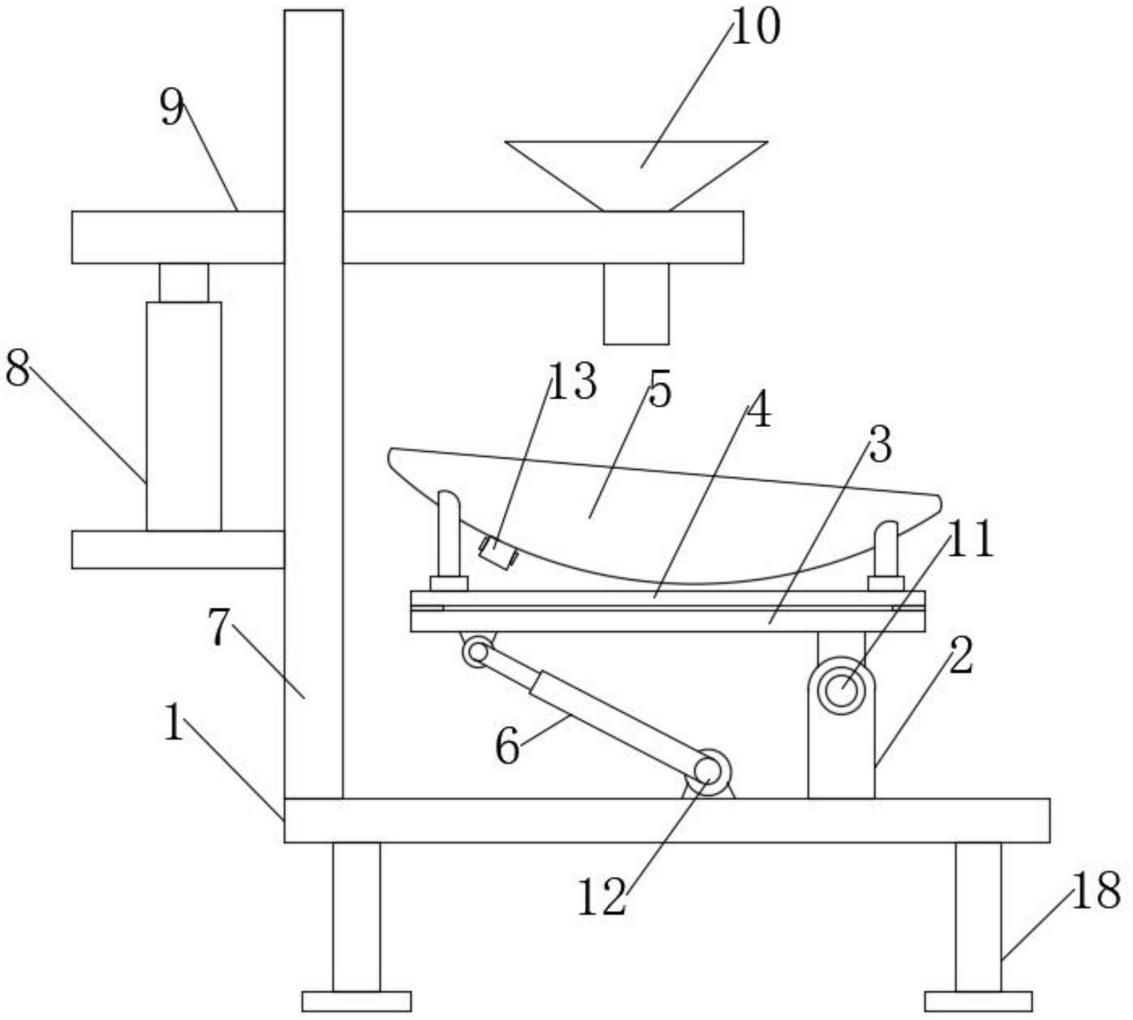 本实用新型提供了一种高精度脱硝尿素生产用计量装置,涉及脱硝尿素生产领域,包括底座,所述底座上表面的一侧固定安装有支架,所述支架的顶部转动安装有称座,所述称座的顶部安装有称板,所述称板的顶部安装有物料斗,所述底座上表面位于称座的下方转动安装有第一气缸,所述第一气缸的活塞杆与称座底部远离支架的一端转动连接。本申请通过支架和第一气缸的设置,在称量之后,可使用第一气缸带动物料斗绕支架翻转,从而可方便将物料斗内的脱硝尿素倒入容器内,提高工作效率,通过振动电机的设置,在倒料时,能够将物料斗内的物料抖出,避免物料残留在物料斗内影响二次称重精度。