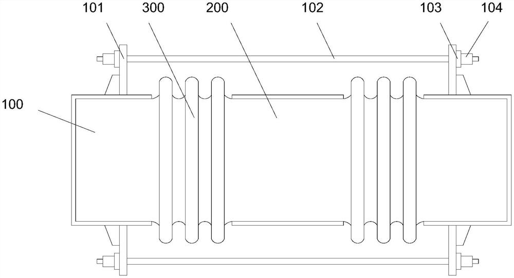 本实用新型公开了一种抗腐蚀金属膨胀节,包括端管、中间管和波纹管,涉及膨胀节技术领域,设置的加强筋网可以紧贴在波纹管的内壁上,避免波纹管产生热膨胀后出现变形或开裂的状况,提高波纹管的整体强度,当波纹管内部气压冲击到其内壁上时,由于橡胶管呈环形阵列状排列在波纹管的内侧,气压将冲击到橡胶管的表面,避免气压直接撞击到波纹管的内壁上,橡胶管的内腔为中空管状结构,将缓冲气囊填充在橡胶管的内部,可以在橡胶管受到冲击时缓冲回弹进行消能,而橡胶管表面涂抹的防腐层为腰果壳油所制成,具有抗冲强度高、摩擦系数稳定、防腐性好的特点,使其可以对橡胶管和波纹管的内壁进行防护,从而延长波纹管的使用寿命。