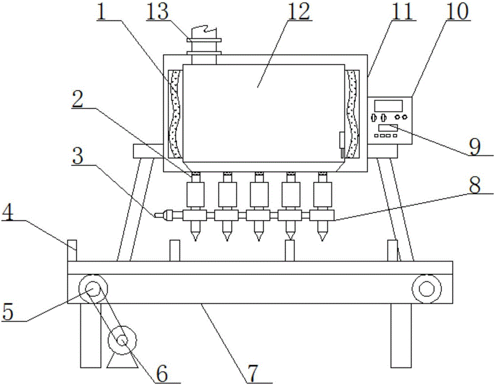本实用新型公开了一种全自动面膜灌装机,包括电加热器和传动轴,所述传动轴嵌入安装在输送床的内部,所述输送床的上方安装有分隔板,且输送床的下方安装有伺服电机,所述输送床的上方设置有面膜液箱,所述面膜液箱的内部安装有面膜液仓,所述电加热器安装在面膜液仓的两侧,所述面膜液箱的顶部安装有进液管。本实用新型采用全自动化灌装工序,提高人力资源使用效率,电加热器能够保证面膜液的均匀快速下流,防止面膜液冷凝造成下流不顺畅的问题,分隔板将面膜袋批量分隔,便于统计面膜数量,微机控制装置内置定时器,伺服电机和按压器同步工作,避免面膜袋灌装遗漏,且灌装效率高,设置有扩口弹片,能够快速打开面膜袋口。