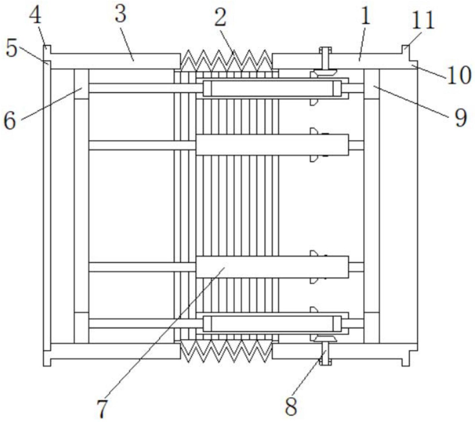 本实用新型公开了一种方便检修的出铁厂用集烟罩,包括第一连接筒、伸缩连接筒和第二连接筒,所述第一连接筒的筒内左端焊接有第一连接环板,所述第一连接环板的左端面均匀分布焊接伸缩杆右端,所述第二连接筒的筒内左端焊接有第二连接环板,所述第二连接环板的右端面焊接伸缩杆的左端,所述第一连接筒左端焊接伸缩连接筒右端;通过调节装置的调节,能够使得伸缩杆进行伸缩工作,同时通过伸缩杆连接第一连接筒与第二连接筒的特性,使得第一连接筒与第二连接筒之间的距离缩短,从而将该节集烟罩从整体中摘除,方便进行检修,同时通过伸缩连接筒的作用,使得该节的整体保证封闭性。