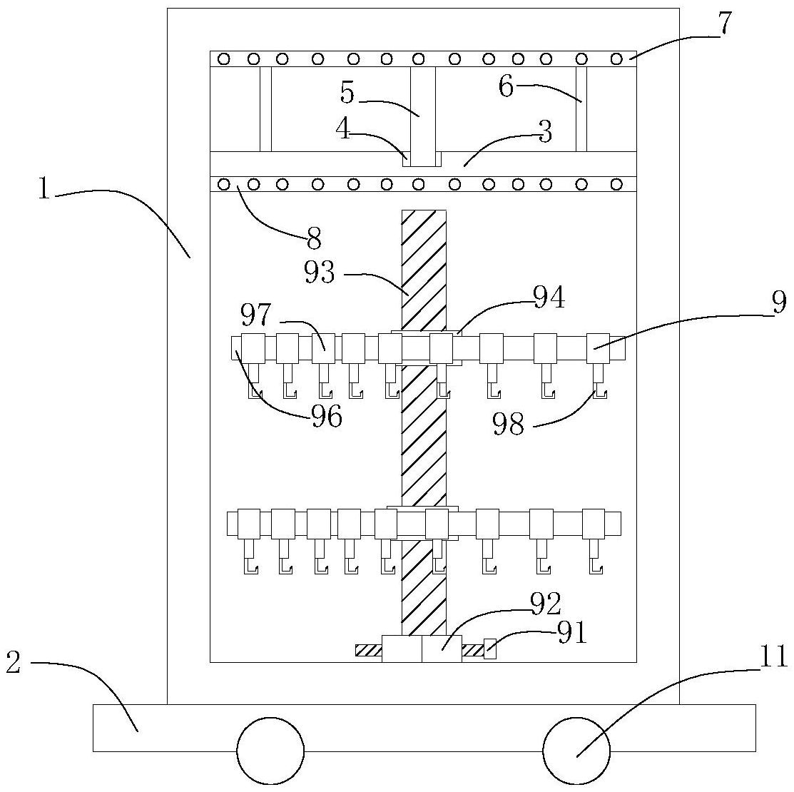 本实用新型涉及衣物存放技术领域,公开了收衣柜,包括器壳和固定板,还包括可拆卸挂衣旋转机构,器壳内腔的底壁与可拆卸挂衣旋转机构连接,固定板的两侧分别与器壳内腔的左壁和右壁固定连接,转杆外表面的底部与轴承的内环固定连接,轴承的外表面与固定板顶部开设的孔洞固定连接,隔板的底部与固定板的顶部贴合,可拆卸挂衣旋转机构包括:螺栓、螺纹杆、螺纹孔连接器和固定架,器壳内腔的底壁上安装有卡盘,螺栓穿过卡盘上的孔洞并与卡盘活动连接,卡盘的内表面与螺纹杆外表面的底部贴合,螺纹孔连接器通过内部螺纹孔与螺纹杆的外表面螺纹螺纹连接。本实用新型通过可拆卸挂衣旋转机构可以将不同季节的衣物进行分类并节省储物空间。