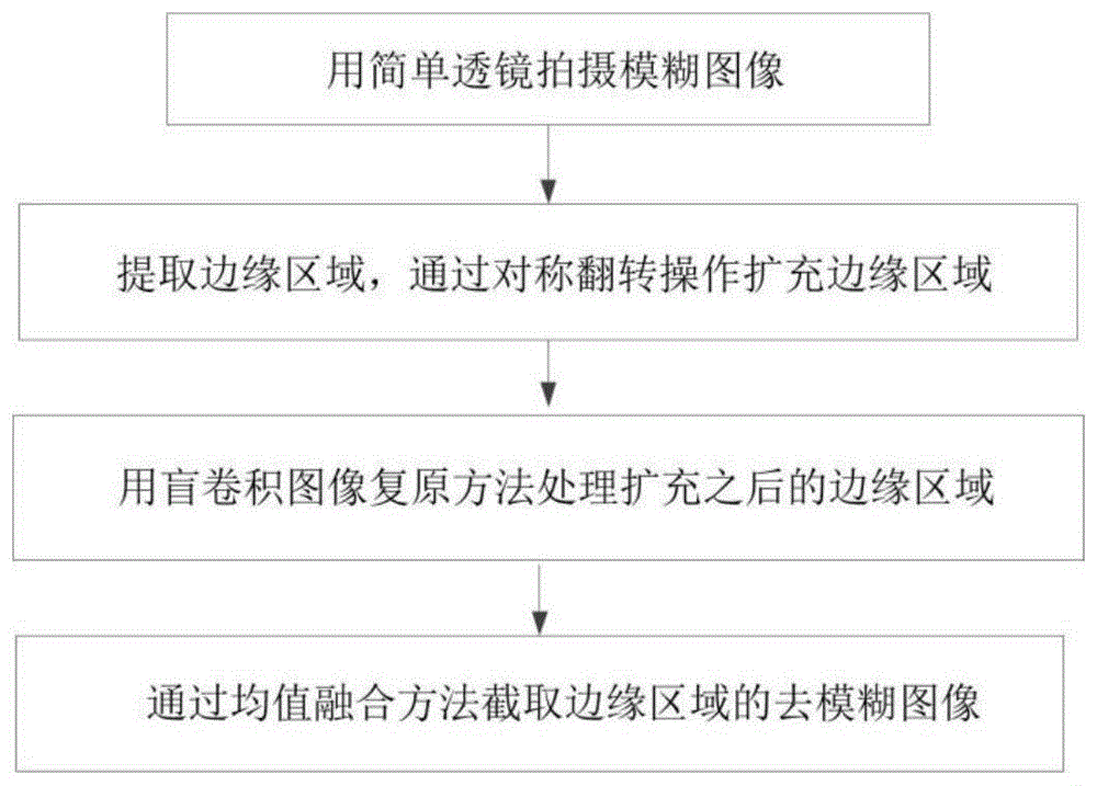 本发明公开了一种基于对称边缘填充的简单透镜边缘区域去模糊方法,涉及图像复原技术领域,包括:用简单透镜拍摄模糊图像;提取边缘,通过对称翻转操作扩充边缘区域;利用盲卷积图像复原算法单独处理边缘区域;通过均值融合方法截取边缘区域的去模糊图像。本方法利用简单透镜模糊核的空间对称性,扩充边缘区域为图像复原算法提供更丰富的图像信息,相对于现有方法,本发明能提高边缘区域的图像复原精度,在图像处理领域具有重要意义。