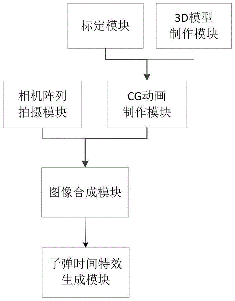 一种CG动画和相机阵列相结合的子弹时间拍摄系统及方法,其中系统包括:对N个相机进行双目标定,获取各相机的内外参数的标定模块;对所拍摄的物体或人体进行3D建模以得到3D模型,并对3D模型恢复纹理映射与反照率的3D模型制作模块;以各相机的内外参数和3D模型为输入,生成N个相机对应的CG图像的CG动画制作模块;采集相机阵列中N个相机的真实场景图像的相机阵列拍摄模块;将获取的N幅真实场景图像与相应的N幅CG图像进行图像合成的图像合成模块;对N幅合成图像进行亮度调整、校正、防抖处理、并对合成后的图像进行拼接处理生成的子弹时间特效生成模块。该系统子弹时间拍摄更自由灵活,且能产生更酷炫的子弹时间特效。