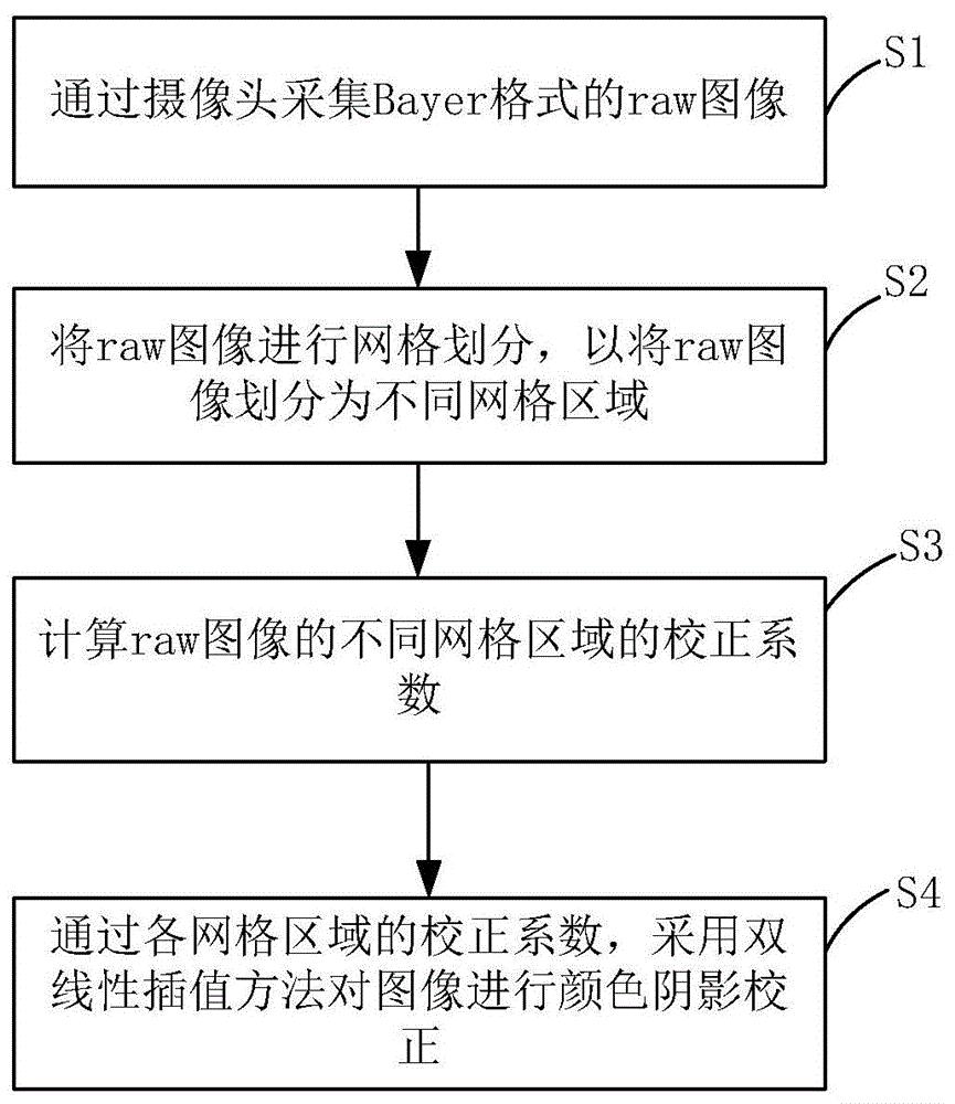 一种基于网格划分的颜色阴影校正方法及其校正系统,属于信息通信技术领域。该方法中,首先,通过摄像头采集Bayer格式的raw图像;其次,将raw图像进行网格划分,以将raw图像划分为不同网格区域;然后,计算raw图像的不同网格区域的校正系数;最后,通过各网格区域的校正系数,采用双线性插值方法对图像进行颜色阴影校正。使得本发明方法能很好地解决径向阴影校正在非对称性下的校正失效问题,适用范围更广,且能更好地消除镜头的色彩偏差问题。