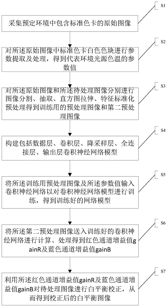 一种使用神经网络进行图像白平衡校正的方法及装置,属于数字图像处理技术领域。包括:S1、采集原始图像;S2、环境光源色温的参数值计算;S3、对所述原始图像和所述待处理图像分别进行预处理得到训练用的预处理图像和第二预处理图像;S4、构建卷积神经网络模型;S5、训练卷积神经网络模型;S6、利用卷积神经网络计算得到红色通道增益值gainR及蓝色通道增益值gainB;S7、利用所述红色通道增益值gainR及蓝色通道增益值gainB对待处理图像进行白平衡校正,从而得到校正后的白平衡图像。该方法解决了现有技术中白平衡容易失效的技术问题,有效的提高了算法的计算速度,精确度得到很大提高,且该模型鲁棒性非常好。