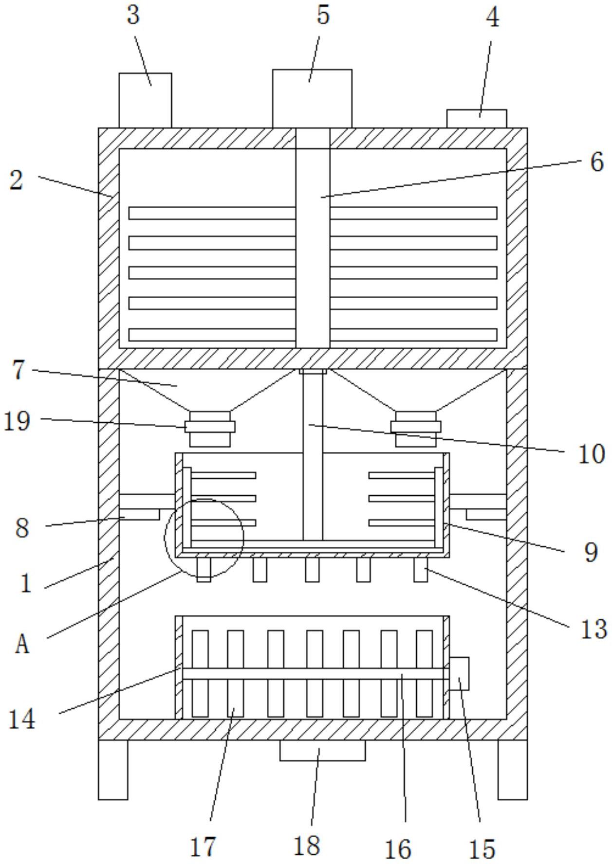 本实用新型公开了一种用于自流平砂浆的原料混合处理装置,包括加工仓,所述加工仓顶部固定连接有搅拌室,所述搅拌室顶部一侧固定连接有进料口,所述搅拌室顶部另一侧固定连接有进水口,所述搅拌室固定连接有驱动电机,所述驱动电机输出轴于搅拌室内固定连接有搅拌架,所述搅拌室底部两侧于加工仓内均固定连接有下料斗,所述下料斗上安装有调节阀,所述加工仓内壁两侧均固定连接有托板,两个所述托板顶部安装有同一个储料盆,所述搅拌架底部于加工仓内竖直安装有连杆,所述连杆底端于储料盆内固定连接有拨动杆,所述拨动杆两端均固定连接有翻料架。本实用新型提高砂浆加工的效率和质量,使用效果好,能够让原料均匀混合,混合处理的方式多样。