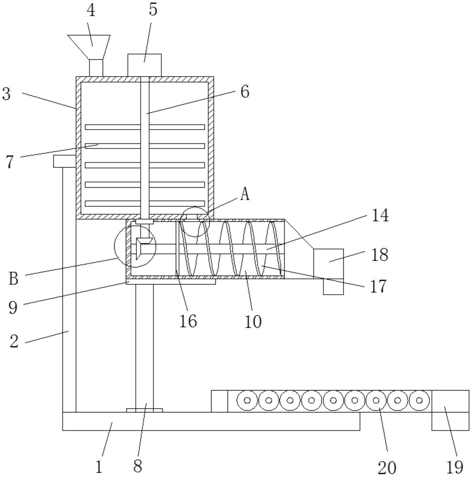 本实用新型公开了一种水泥自流平砂浆生产用自动装袋机构,包括底座,所述底座顶部一侧固定连接有支撑杆,所述支撑杆一侧安装有储料桶,所述储料桶顶部一侧固定连接有进料斗,所述储料桶顶部固定连接有驱动电机,所述驱动电机输出轴于储料桶内部固定连接有轴杆,所述轴杆两侧均固定连接有拨杆,所述底座顶部转动连接有立柱,所述立柱顶部固定连接有托板,所述托板顶部安装有输送仓,所述输送仓顶部与储料桶底部相抵接,所述轴杆底部贯穿储料桶于输送仓内固定连接有传动锥齿轮,所述储料桶底部一侧开设有下料口。本实用新型可以在装袋前对砂浆料结块进行打散破碎处理,使用效果好,能够实现砂浆料自动装袋,还能调整装袋速度,提高装袋的效率。