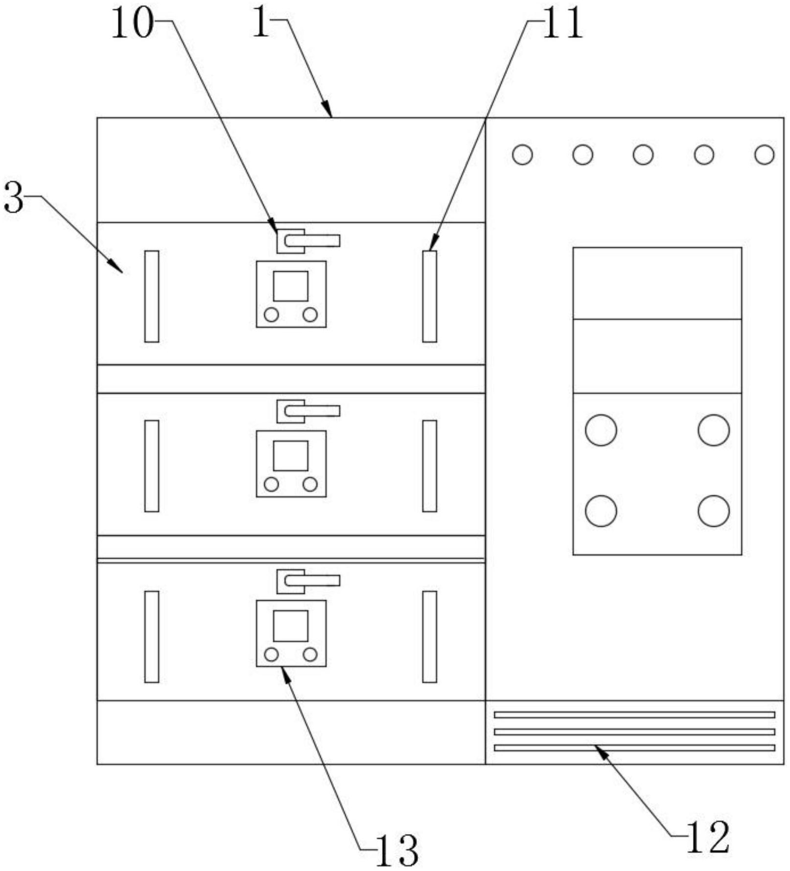 本实用新型公开了一种具有多层抽屉结构的低压开关柜,涉及低压开关柜领域,针对现有的部分低压开关柜的不具备多层抽屉结构,存在安装较为麻烦,同时散热效果较差的问题,现提出如下方案,其包括主体,所述主体内部设置有第一安装板,所述第一安装板上方设置有抽屉,所述抽屉内部设置有放置板,所述放置板底部设置有伸缩杆,所述放置板上表面设置有固定块,所述抽屉内部表面设置有隔热层,所述主体一侧设置有安装箱,所述主体内部顶端设置有保护罩,所述保护罩内部设置有散热风扇,所述抽屉底部设置有安装架。本实用新型结构新颖,且具有多个抽屉,增加装置的安装容量,同时增加了装置的散热效果,使电气元件的安装难度降低,并增加了安全性。