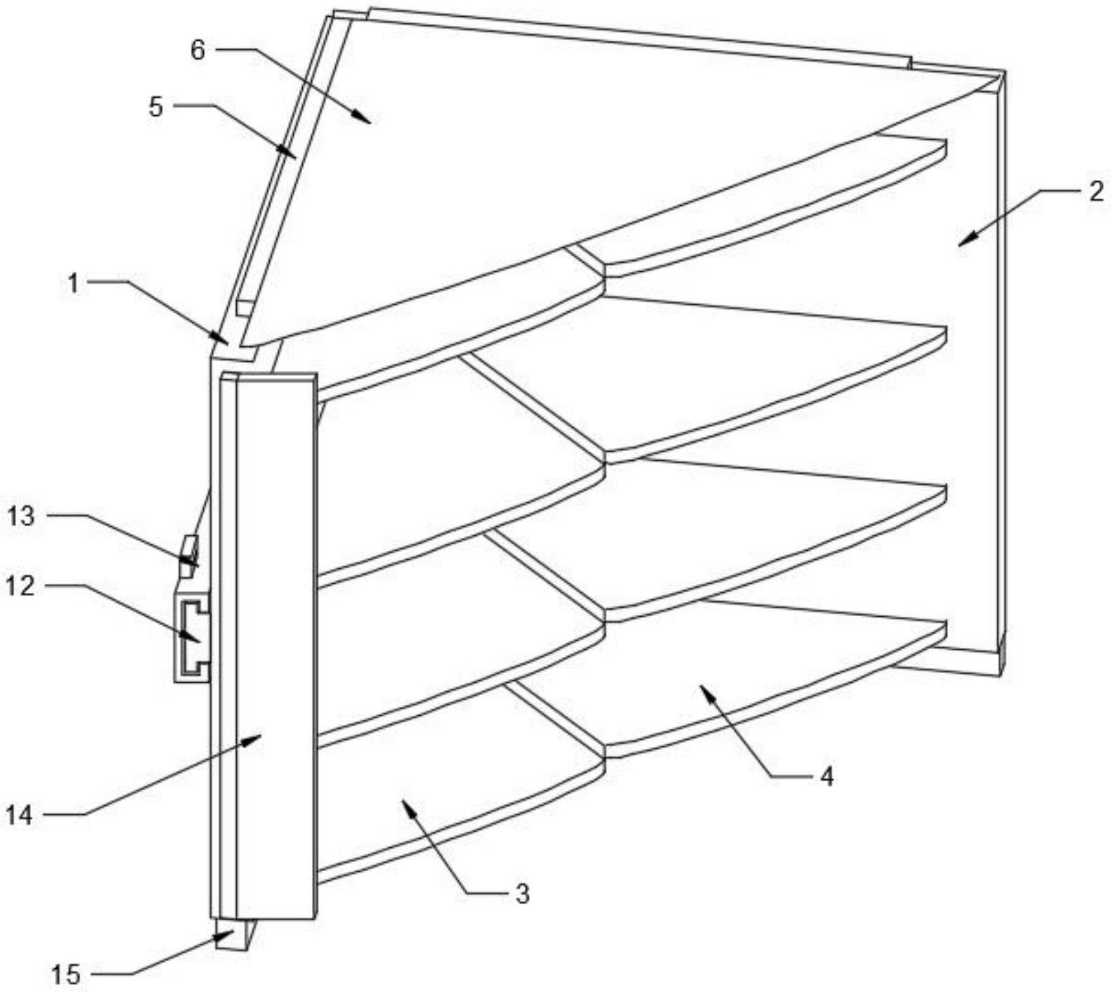 本实用新型公开了一种固定式转角低压开关柜,涉及低压开关柜领域,针对目前市面上存在的低压转角开关柜通常为一体式的,无法进行角度调节的问题,现提出如下方案,其包括左板,所述左板的一侧铰接有右板,且所述右板的顶部固定安装有连接块,所述连接块设置有两组,且其分别位于左板与右板的顶部,所述连接块的顶部安装有防水皮布,所述左板的一侧均匀分布有第一垫板,所述右板的一侧均匀分布有第二垫板,且所述第一垫板与第二垫板为错位分布。该固定式转角低压开关柜不仅可以通过转动左板与右板从而改变该装置的夹角适配不同角度的墙体,并且通过滑动槽与滑动块相结合更加便于对该装置进行检修与更换。