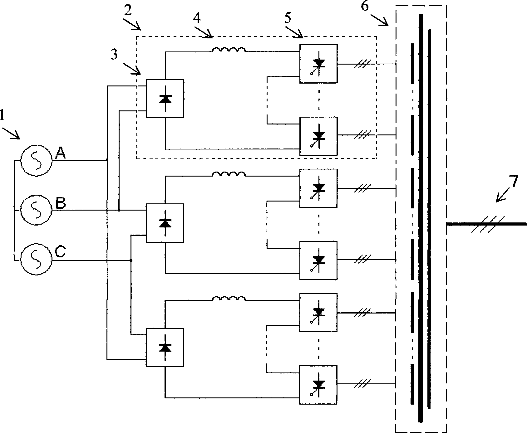 本发明涉及一种电能回馈装置。本发明的特点是,其包括一个由发电设备产生的三相交流输入电源;一个用于向电网回馈电能的隔离变压器,该变压器原边为三相绕组,与电网联接,其副边为多路三相绕组;多个功率变换单元,各功率变换单元的输入端与上述三相交流电源中的两相联接,功率变换单元的输出端,分别与上述隔离变压器的副边绕组连接。上述功率变换单元包括一个由二极管连接成的、将单相交流电变为直流电的整流桥电路;一个与上述整流桥电路的输出端联接的电感;以及一个与上述电感及整流桥电路联接的晶闸管三相全控桥式电路或晶闸管三相全控桥式电路串,该晶闸管三相全控桥式电路串是由多个晶闸管三相全控桥式电路的直流端串联联接而成。本发明的目的是设计一种电能回馈装置,成本低,可靠性高,转换效率高,发电机输出端电流及网侧电流正弦度高,谐波含量低,可大量推广使用,以提高清洁能源发电的利用率。