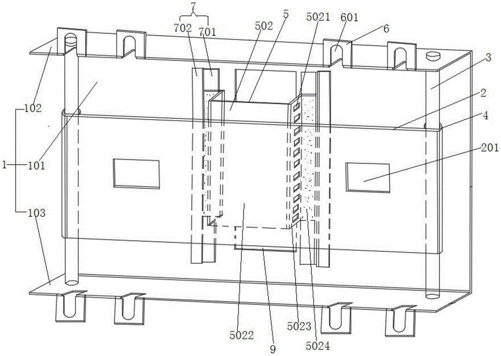 本实用新型公开了一种双塑壳断路器开关同步控制装置,包括壳体、滑块和两个滑轨支撑柱,所述滑块上具有两个套筒且分别设置于所述滑块的左右两端,所述套筒套设于所述滑轨支撑柱上,所述滑轨支撑柱的两端与所述壳体固定连接,所述滑块上设置有两个贯穿孔。本实用新型的双塑壳断路器开关同步控制装置,可以实现断路器开关的同步快速开合。
