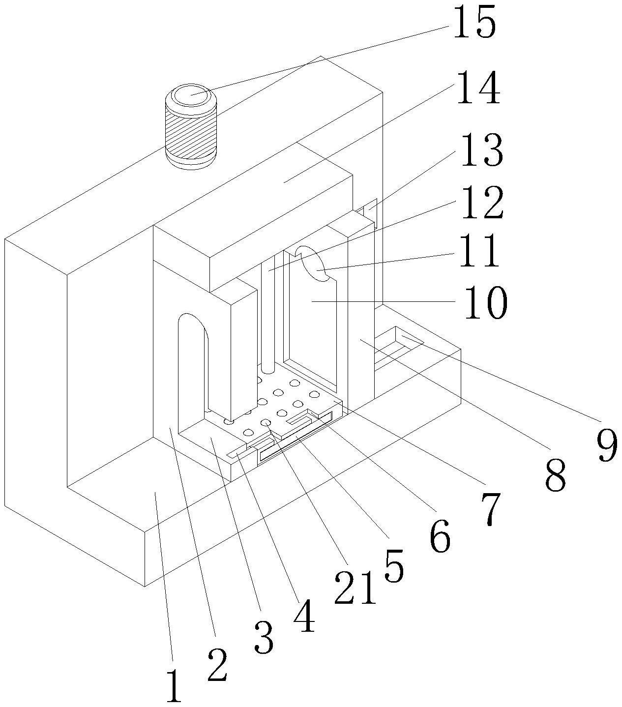 本实用新型涉及齿轮箱加工技术领域,且公开了一种齿轮箱的测试架,包括支撑架,所述支撑架为“L”形,支撑架的内部为中空结构,支撑架横向板的顶部固定连接有第一支撑板,第一支撑板的左侧开设有第一移动槽,第一移动槽同样为“L”形,第一支撑板的右侧开设有滑槽,支撑架横向板的顶部开设有第一滑动槽。该齿轮箱的测试架,通过使放置板向上进行移动,当齿轮箱的左端滑入放置孔的内部后,启动第二电机使第一螺纹杆进行转动,进而使第二支撑板向左进行移动并对齿轮箱进行夹紧固定,同时通过放置孔与限位槽和挡板的配合,使齿轮箱的固定更加的稳定,在一定程度上减少齿轮箱在进行检测时出现滑动的情况。