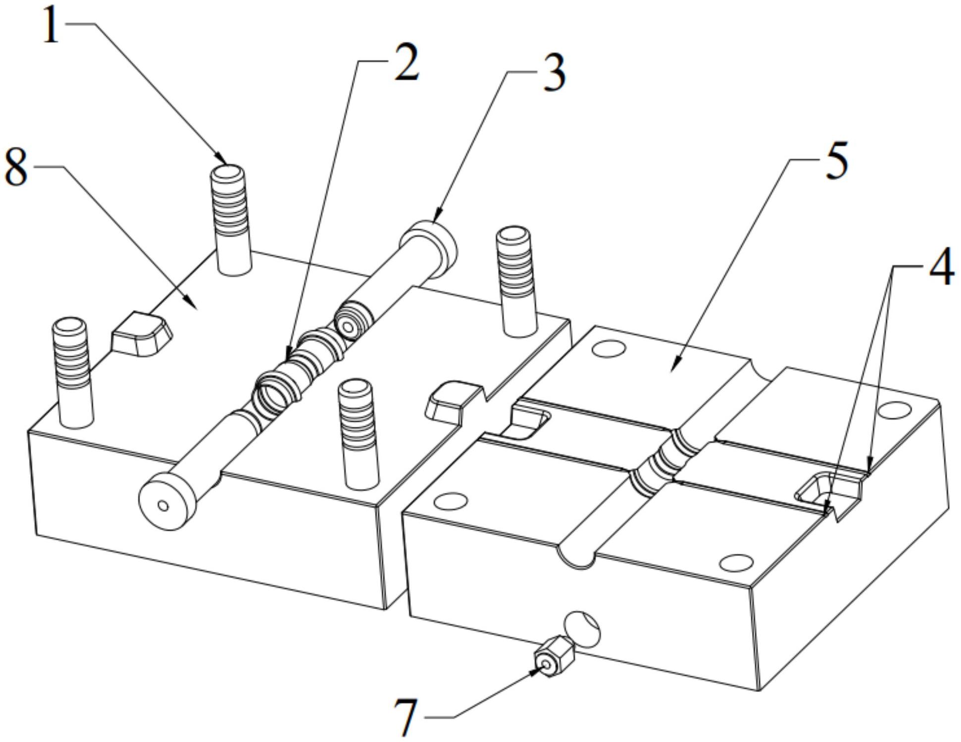 本实用新型公开了一种凸环管件水涨模具,包括:上模、下模;所述上模的边角处安装有导柱;所述下模的边角处对应设置有定位通孔,与所述导柱相配合;所述上模设有管状型腔上腔,所述下模设有管状型腔下腔;管状型腔两端设置有冲头;所述管状型腔上腔、下腔内侧分别加工有向外侧凹陷的半圆环结构,并在所述管状型腔上腔、下腔组合后形成相应的凸环型腔;所述半圆环结构处沿合模面设置有排气槽;本实用新型通过在凸环型腔的合模面设置排气槽,有效将残存气体排出,保证产品复杂表面与模具内腔表面的贴合程度,进而提升加工精度,提高产品质量。