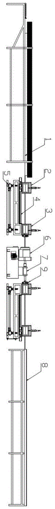 本实用新型涉及钢管加工相关技术领域,具体是一种不锈钢焊管的自动压花装置,包括压花成型装置及关于所述压花成型装置对称的两个定长输送及减速机构,两个所述定长输送及减速机构远离所述压花成型装置的一侧分别设置有上管架和下管架,其中:所述定长输送及减速机构包括安装在支撑架上的定长出管装置及夹紧减速装置,所述支撑架上还设置有螺纹输送装置,所述螺纹输送装置与所述定长出管装置连接。通过设置的定长出管装置对钢管进行夹持,并配合螺纹输送装置将所述定长出管装置及钢管整体进行输送,以实现钢管的定长输送,通过设置的减速装置在压花成型装置工作过程中,对钢管产生摩擦力,以降低钢管的转动速度,从而提高压花效果。