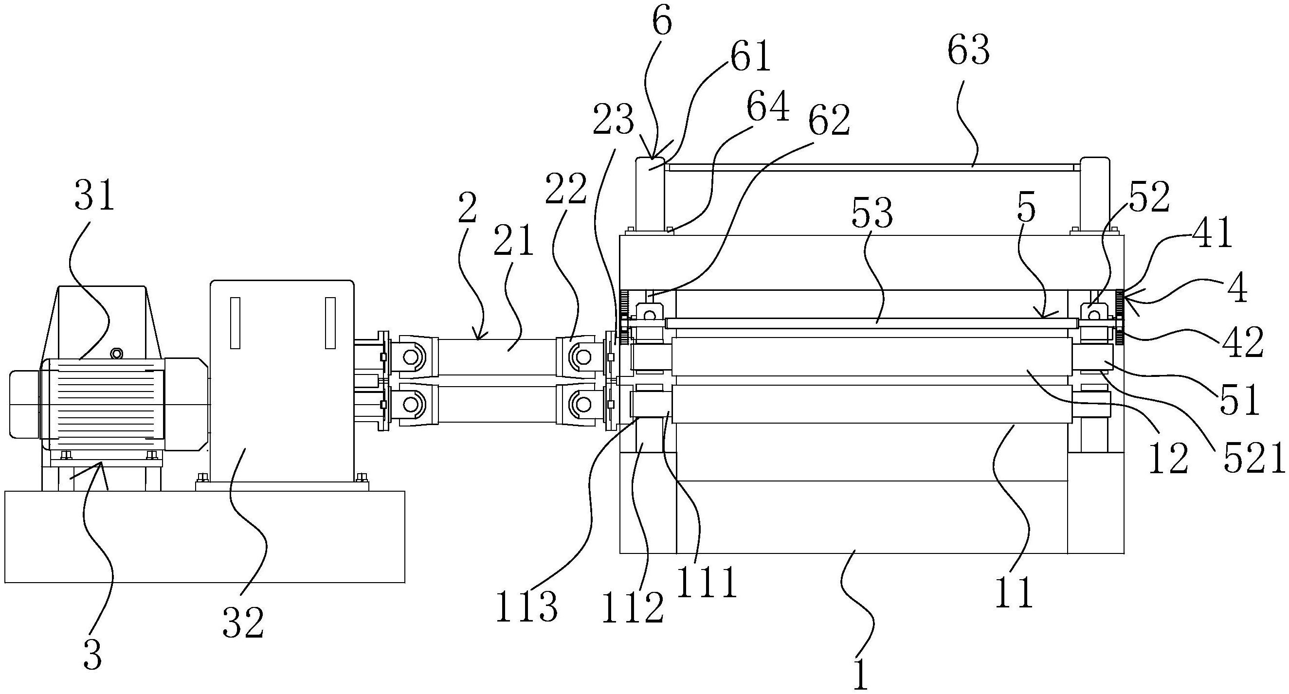 本实用新型涉及一种校平机进料夹棍升降调节平衡装置。它解决了现有技术中进料夹棍容易出现高度不一致的问题。它包括夹送辊机架,夹送辊机架上设有定位输送辊,且定位输送辊上侧设有升降调节辊,升降调节辊及定位输送辊任意一端通过转动连接组件连接有转动驱动机构,夹送辊机架机上设有齿轮同步结构,且齿轮同步结构与设置在升降调节辊上侧的同步联动机构相连,同步联动机构与升降调节辊两端连接并通过设置在夹送辊机架上端的升降驱动装置驱动。本实用新型的优点在于:使夹送辊两端能够同步升降,有效确保了进料间隙高度的一致性,使用效果好。