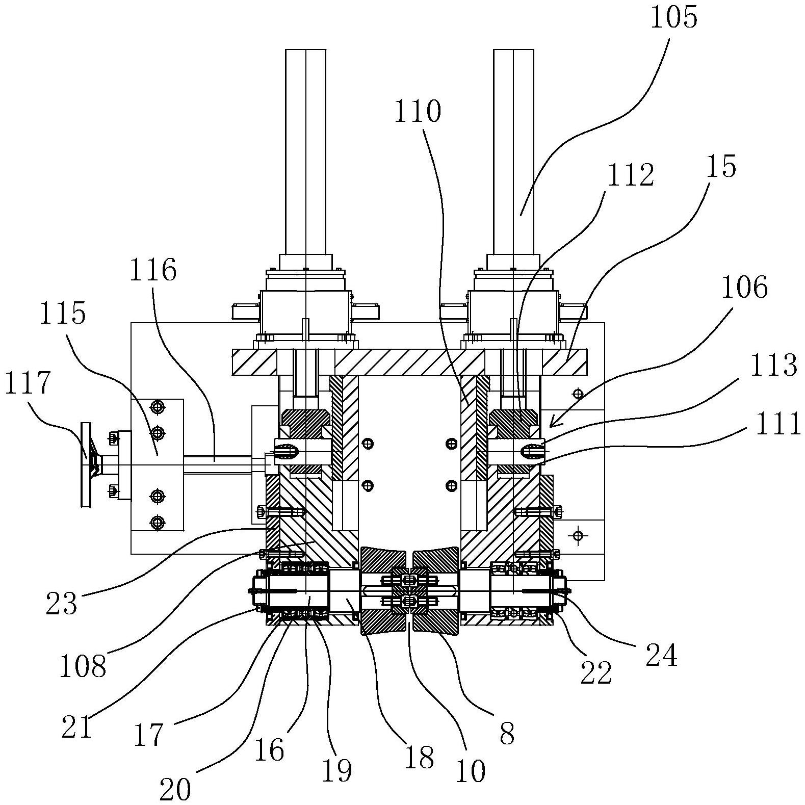 本实用新型提供了一种焊接组件的上辊模块,属于圆管生产设备技术领域。它包括设置在机架上的连接块和二号上辊体座,所述的二号上辊体座和连接块通过滑块滑轨结构活动连接。二号上辊体座上两对称设置的二号上辊体能够对管材的焊缝进行定型,通过调节两个二号上辊体之间的预留间隙大小能够调整对管材焊缝的大小,平移机构能通过连接块上的滑块滑轨结构驱动二号上辊体座横向移动,从而能驱动管材上的焊缝与焊机对齐,独立驱动机构能驱动二号上辊体沿垂直方向升降从而能够调整管材焊缝与焊机之间的距离,从而能够从垂直方向和水平方向及时调整管材焊缝与焊机之间的位置,提高焊接效率。