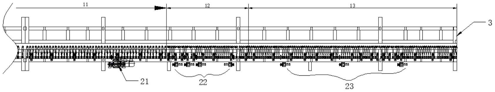本实用新型提供了一种连续式玻璃钢化炉中加热炉输送线,属于玻璃钢化领域。包括传送辊道和驱动机构,其输送线由后向前划分为平速段、加速段、快速段,平速段的传送辊道由平速电机控制,加速段的传送辊道由加速电机控制,快速段的传送辊道由快速电机控制,玻璃在平速段匀速移动,整体进入加速段后变速加快传送速度进入快速段,玻璃离开加速段后加速段恢复原速承接后续玻璃,玻璃在快速段匀速快速移动直至离开炉门口;玻璃限制在快速段被加热至钢化所需温度。本实用新型通过改变加热炉输送线辊道的输送频率,限定玻璃在快速传送阶段被加热至钢化所需温度,从而克服玻璃的“波浪纹”现象,保障了玻璃的平整度,为超薄玻璃的规模生产提供了可行性。