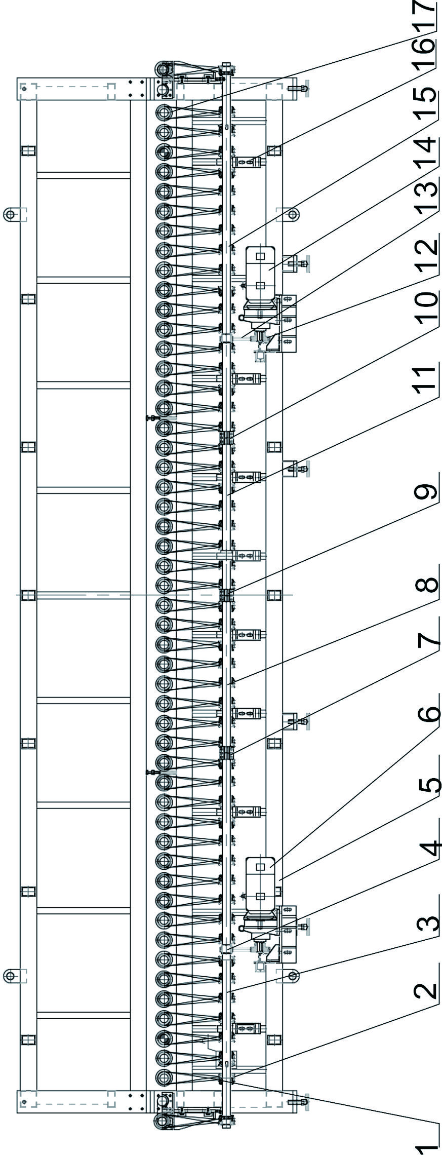 一种钢化炉辊道传动系统中的双电机拖动结构,涉及一种双电机拖动结构,包括电机和传动轴,在传动轴上间隔均匀的设有多个主动皮带轮,多个主动皮带轮分别与相对应的多个辊道皮带轮通过O形带连接,电机包括减速电机A和减速电机B,减速电机A与减速电机B分别设置传动轴的下部,在传动轴的两端和中部均设有轴承座,传动轴包括四根依次连接成直线型的主传动轴A、主传动轴B、主传动轴C和主传动轴D,减速电机A上的减速机链轮与主传动轴A上设置的主动链轮通过磙子链条连接,减速电机B上的减速机链轮与主传动轴D上设置的主动链轮通过磙子链条连接;本实用新型达到了减少钢化玻璃辊道面目划痕的目的,提高了钢化玻璃的表面质量。
