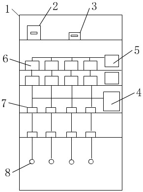 本实用新型提出的是玻璃钢化生产线运行控制柜。在柜体内上部装有主空气开关和备用空气开关,主空气开关电源与高压变压器直接连接,高压变压器分别于两个低压变压器电路连接,低压变压器的输出电压输送给PLC控制器,供PLC控制器运行使用,从PLC控制器引出的控制线通过高压变压器输出线后,经过中间继电器通过接线端子输出点位机构。本实用新型通过在控制柜能够利用PLC控制器控制玻璃钢化生产线自动运行,具有控制功能全,性能稳定,使得玻璃钢化生产线运行平稳,生产效率得以提高。适宜作为玻璃钢化生产线运行控制柜使用。