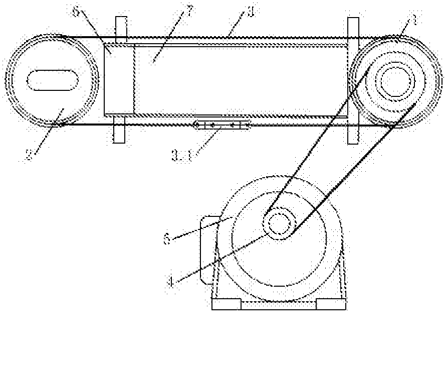 本实用新型提出的是玻璃标签输送线。主动链轮与从动链轮之间通过链条回转连接,主动链轮与从动链轮分别安装在链轮座板上,并通过结构架连接成一体,电动减速机通过减速机驱动链轮经过传动链将动力传递到与主动链轮同轴的主动链轮上,在链条上设有挂钩连接板,挂钩连接板的外侧与标签挂钩上部连接,在结构架下部设有悬挂导轨支座,并装有导轨和直线轴承,标签挂钩的上部通过螺栓固定在挂钩连接板上,并随链条与挂钩连接板回转,传送标签。由于本实用新型采用链条牵引标签挂钩的上部,标签挂钩的下部连接在直线轴承上并延导轨移动,使得标签挂钩既有牵引动力,又有限位控制,标签挂钩输送平稳可靠。适宜作为标签输送线使用。