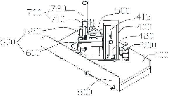 本实用新型提出的是型材切割装置,包括底座设有第一镂空部以及第二镂空部;旋转台设置在底座上端,通过转轴与底座旋转连接;第一驱动件设置在底座的下端,并且通过第二镂空部与旋转台连接,用于驱动旋转台以转轴为轴心在底座上旋转;升降机构与第二镂空部对应设置于旋转台上端,升降机构前端横向装配有切割机,能够带动切割机升降,切割机的切割刀片的置于第一镂空部的上部;限位机构设置在升降机构的侧壁,向切割机方向延伸,用于对型材定位;本实用新型通过旋转台旋转调整角度,使切割机置于型材合适角度,通过限位机构对型材限位后,升降机构下落使切割机对型材进行切割,无需多次手动调整切割机锯片倾斜角度,单人便能完成型材的精准切割。