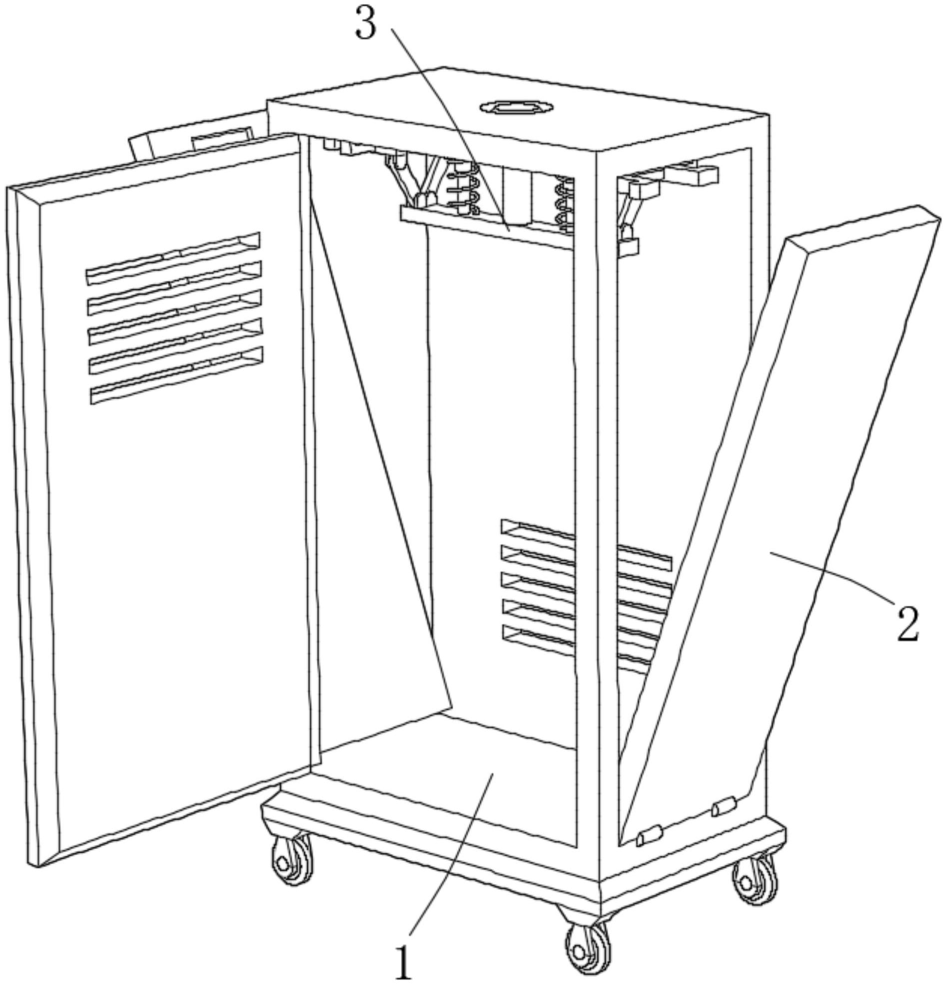 本实用新型公开了新风换气机技术领域的一种智能净化柜式新风换气机,包括新风换气机主体,新风换气机主体的两侧均转动连接有一侧板,侧板通过卡合组件进行卡合;新风换气机主体包括一新风换气机外壳体,新风换气机外壳体的两侧均开设有一方形侧槽,新风换气机外壳体的顶部开设有一通孔;侧板的顶端一侧面开设有一方形插槽,方形插槽的一相对内壁上均开设有一卡槽;卡合组件包括一下压柱,下压柱穿过通孔,下压柱的底端固定安装有一条形横板,条形横板的上表面固定安装有两对称设置的导向柱。本实用新型能够简单方便的打开智能净化柜式新风换气机的侧板,从而便于对其侧面进行维修,从而极大的提高了维修的效率,易于推向市场。