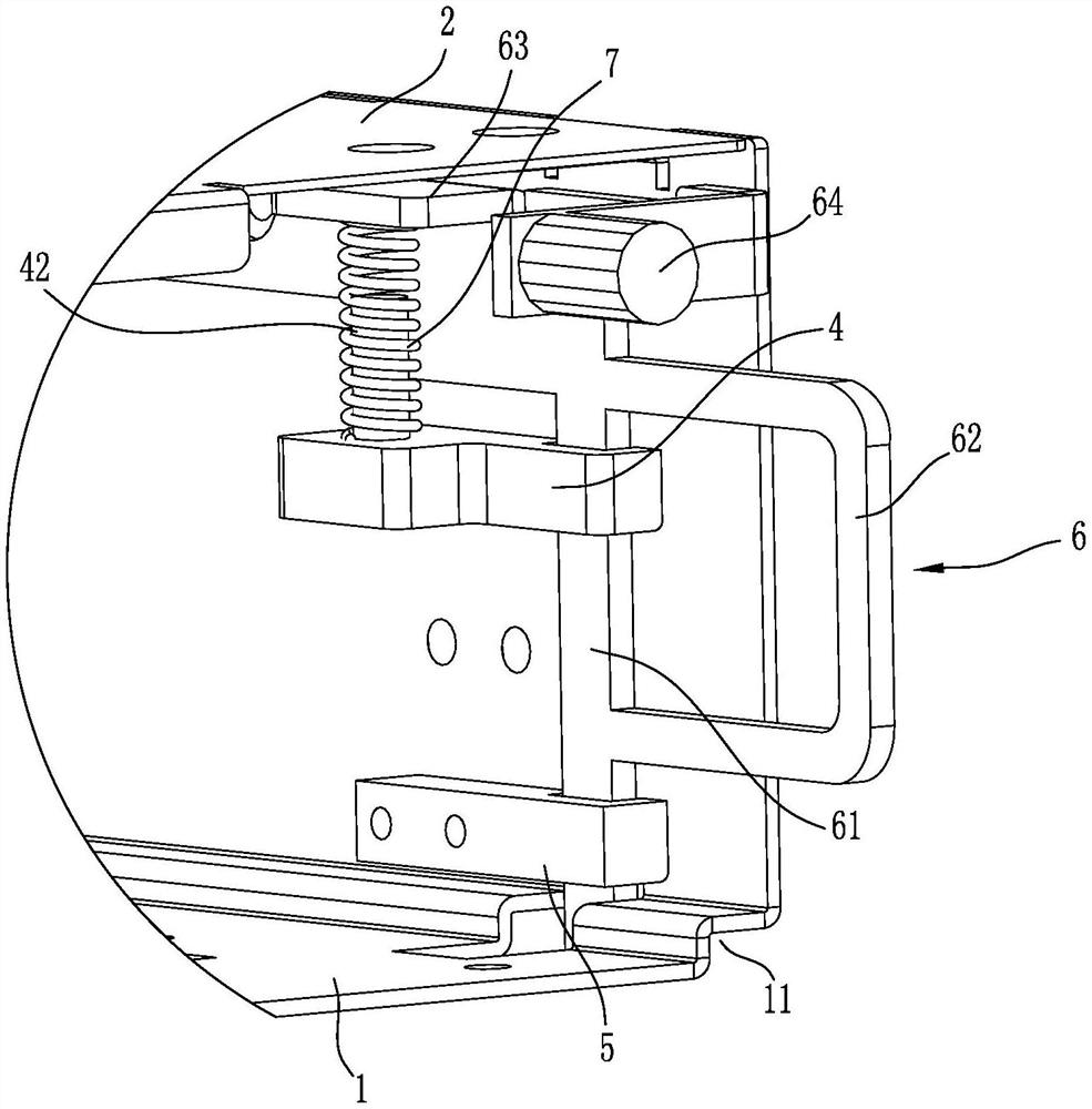 本实用新型公开了一种智能直流配电单元门闩结构,包括配电单元底托和配电单元上盖,所述配电单元底托和配电单元上盖的前端之间设置有配电单元前端板;配电单元底托的两侧底部分别设置有导槽;配电单元底托的内侧壁上固定安装有门闩上限位块和门闩下限位块,所述门闩上限位块和门闩下限位块之间安装有可上下滑动的门闩,所述门闩与所述门闩上限位块或门闩下限位块之间设置有限位弹簧。通过配电单元底托上的导槽结构可以与一体化插框进行配合安装,满足其更换的便捷性,满足安装的兼容性和便捷性。通过门闩上限位块、门闩下限位块和限位弹簧,使门闩整体形成一个能上下自由活动的机构,满足上下自由行程的同时,也可实现其整体的前后推拉。