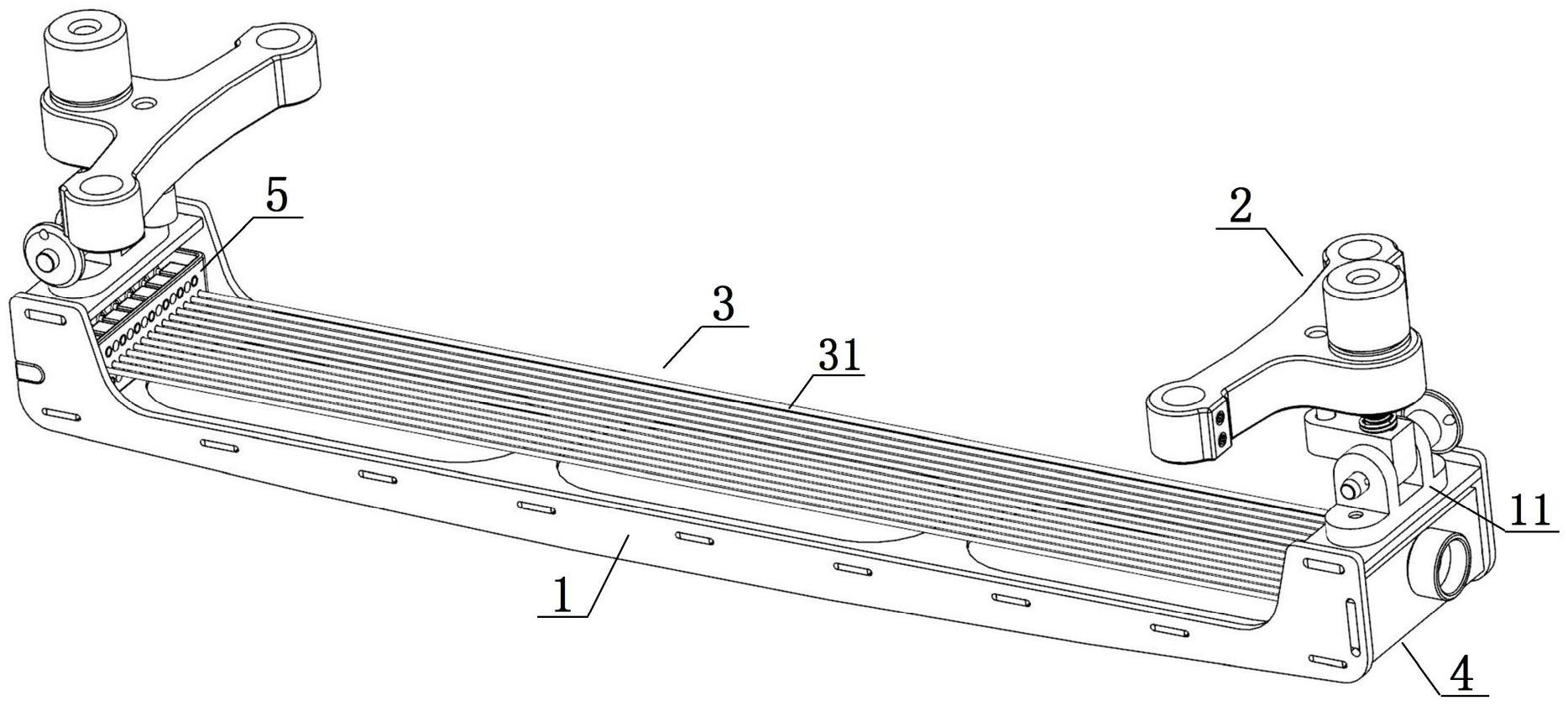 本实用新型公开了一种新型响弦调节器,包括设置于鼓体下方的安装架,安装架的两端的顶部均固定设置有连接座;连接座分别通过高度调节组件与鼓体的外侧相连;安装架与鼓体之间设置有沙带,沙带由若干等间距平行设置的响弦丝组成;沙带的一端通过第一张力调节组件与安装架相连,用于整体调节沙带的张力;沙带的另一端通过第二张力调节组件与安装架相连,用于调节任一单根响弦丝的张力。本实用新型的响弦调节器可进行两端调节,调节方便,调节精度高,确保了沙带的发音效果。
