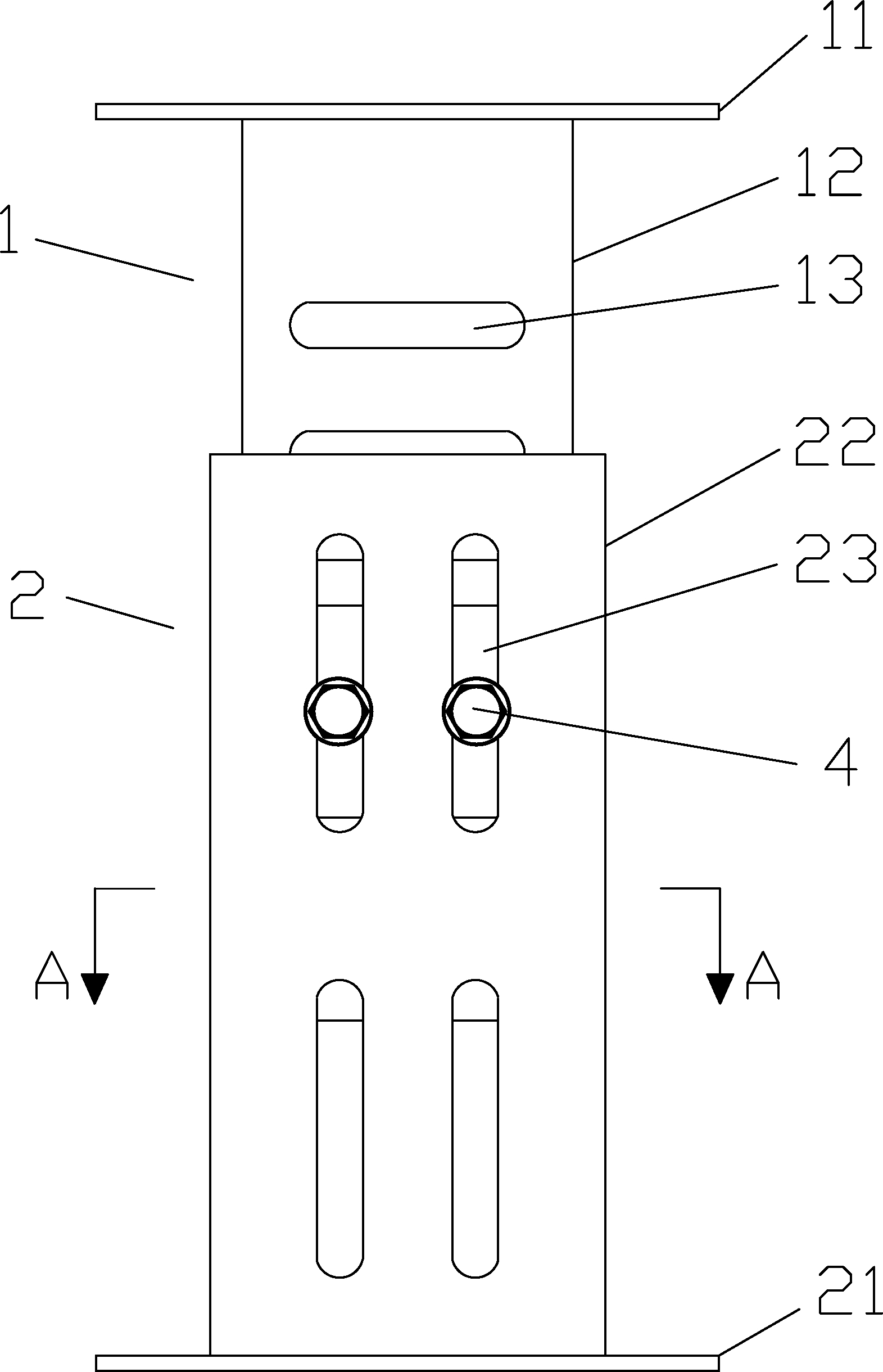 本实用新型公开了一种电梯缓冲器安装调节装置,包括上、下连接件,所述上连接件包括用于支撑缓冲器的支撑板和位于支撑板底部的上连接杆,所述上连接杆上设有多个槽孔Ⅰ,多个槽孔Ⅰ之间水平间隔设置,所述下连接件包括用于连接地面的连接板和位于连接板上方的下连接杆,所述下连接杆上设有多个槽孔Ⅱ,多个槽孔Ⅱ之间竖直间隔设置,上、下连接杆之间通过可穿过槽孔Ⅰ、Ⅱ的螺栓相互连接。本实用新型的上连接件用于连接缓冲器,下连接件用于连接地面,上下连接件之间通过螺栓连接,当需要缓冲器的高度时,只需拧松螺栓,调节上下连接件的相对位置,然后再将螺栓拧紧即可,使用方便简单、安装快捷,节省了人力物力。