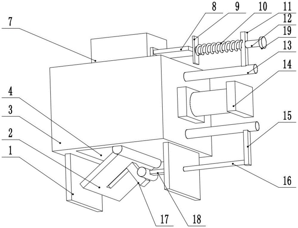 本实用新型涉及饲料加工技术领域,公开了一种新型饲草压块机,包括主体,主体下表面左侧设有卸料口,主体下表面中部转动连接底板,主体上表面右侧设有进料口,进料口上部设有进料板,所述主体中部滑动连接压板,压板上下两端固定连接导向杆,上端导向杆右侧固定连接第一推板,第一推板上部滑动连接推杆,推杆左端固定连接限位板,限位板左端固定连接挡板,下端导向杆右侧固定连接第二推板,第二推板下部固定连接第一连杆,第一连杆左端铰接第二连杆,第二连杆左端铰接滑块下部。本实用新型适用于饲草的压缩装置中,通过一个运动单元同时控制压板、底板和挡板三个部件的运动,使得整个装置结构更加紧凑,更加适合自由移动。