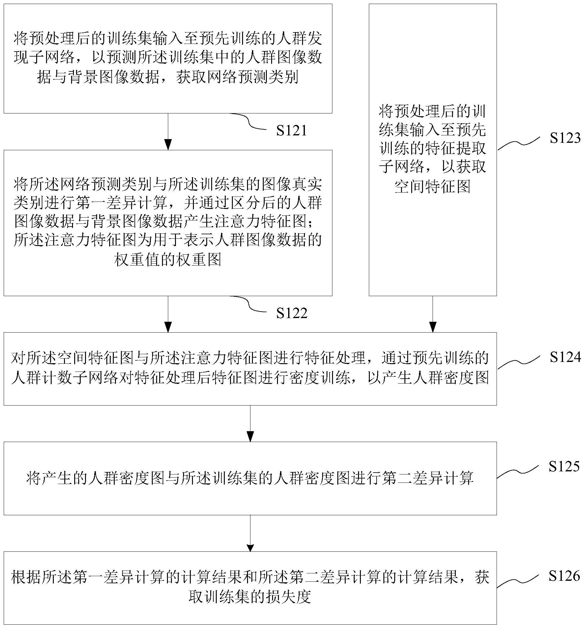 本发明提供一种多任务联合训练的人群计数网络方法、系统、介质及终端,所述多任务联合训练的人群计数网络方法包括:将预处理后的训练集输入至预先训练的人群发现子网络,进行第一差异计算,并产生注意力特征图;同时,输入至预先训练的特征提取子网络,以获取空间特征图;对所述空间特征图与所述注意力特征图进行特征处理与密度训练,以产生人群密度图;将产生的人群密度图与所述训练集的人群密度图进行第二差异计算;根据所述第一差异计算的计算结果和所述第二差异计算的计算结果,获取训练集的损失度。本发明可在避免人群遮挡问题的同时实现有效地预测人群密度,统计人群数量,能够更准确地处理拥挤场景中多样化的人群分布。