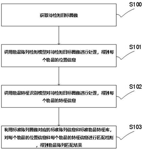 本发明公开了一种物品陈列检测方法、装置、设备及可读存储介质,应用于信息处理领域。包括获取待检测目标图像;调用物品陈列检测模型对待检测目标图像进行处理,得到每个物品的位置信息;调用物品特征识别模型对待检测目标图像进行处理,得到每个物品的特征信息;利用标准陈列图像对应的标准陈列信息和标准物品特征库,对每个物品的位置信息和每个物品的特征信息进行匹配检测,得到物品陈列匹配结果。本发明与现有技术通过人工进行物品陈列检测相比,本发明直接利用标准陈列图像对应的标准陈列信息和标准物品特征库,对每个物品的位置信息和每个物品的特征信息进行匹配检测,更加智能化地实现了对物品陈列的检测,提高了检测速度和准确度。