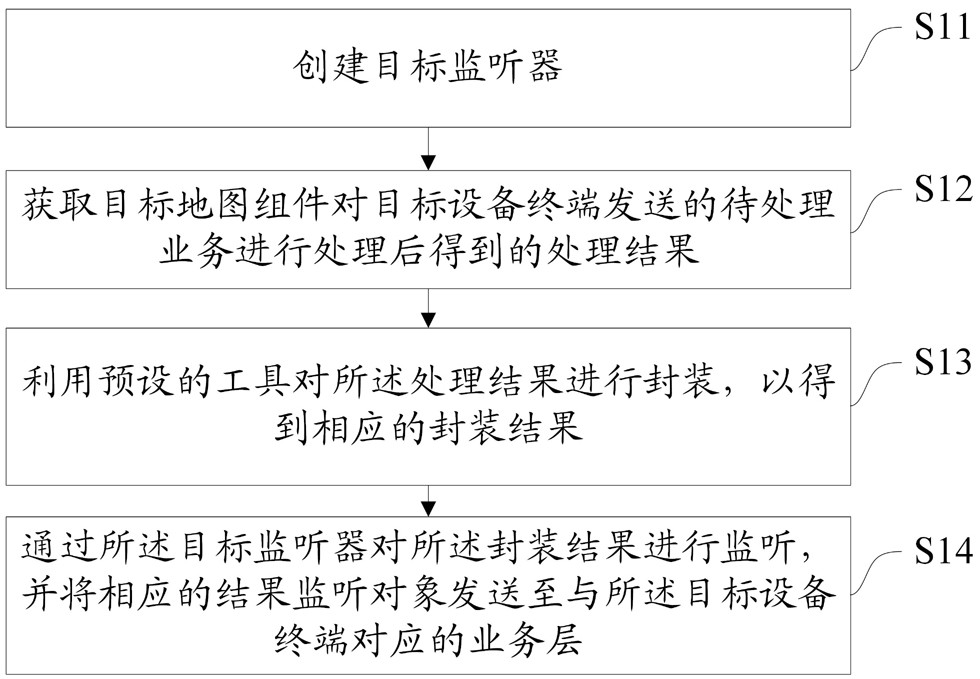 本申请公开了一种地图组件封装方法、装置、设备及介质,涉及组件化、类封装的技术领域,所述方法包括:创建目标监听器;获取目标地图组件对目标设备终端发送的待处理业务进行处理后得到的处理结果;利用预设的工具对所述处理结果进行封装,以得到相应的封装结果;通过目标监听器对封装结果进行监听,并将相应的结果监听对象发送至与目标设备终端对应的业务层。由此可见,本申请将目标地图组件的处理结果进行封装,并将封装好的对象提供给业务层,省去了在对接不同地图组件时需要查阅文档,进行各种配置的过程,提高了效率,并降低了对接成本。同时本申请还支持在不同的地图组件类型中自由切换,以便在具体业务中选择合适的地图组件类型。