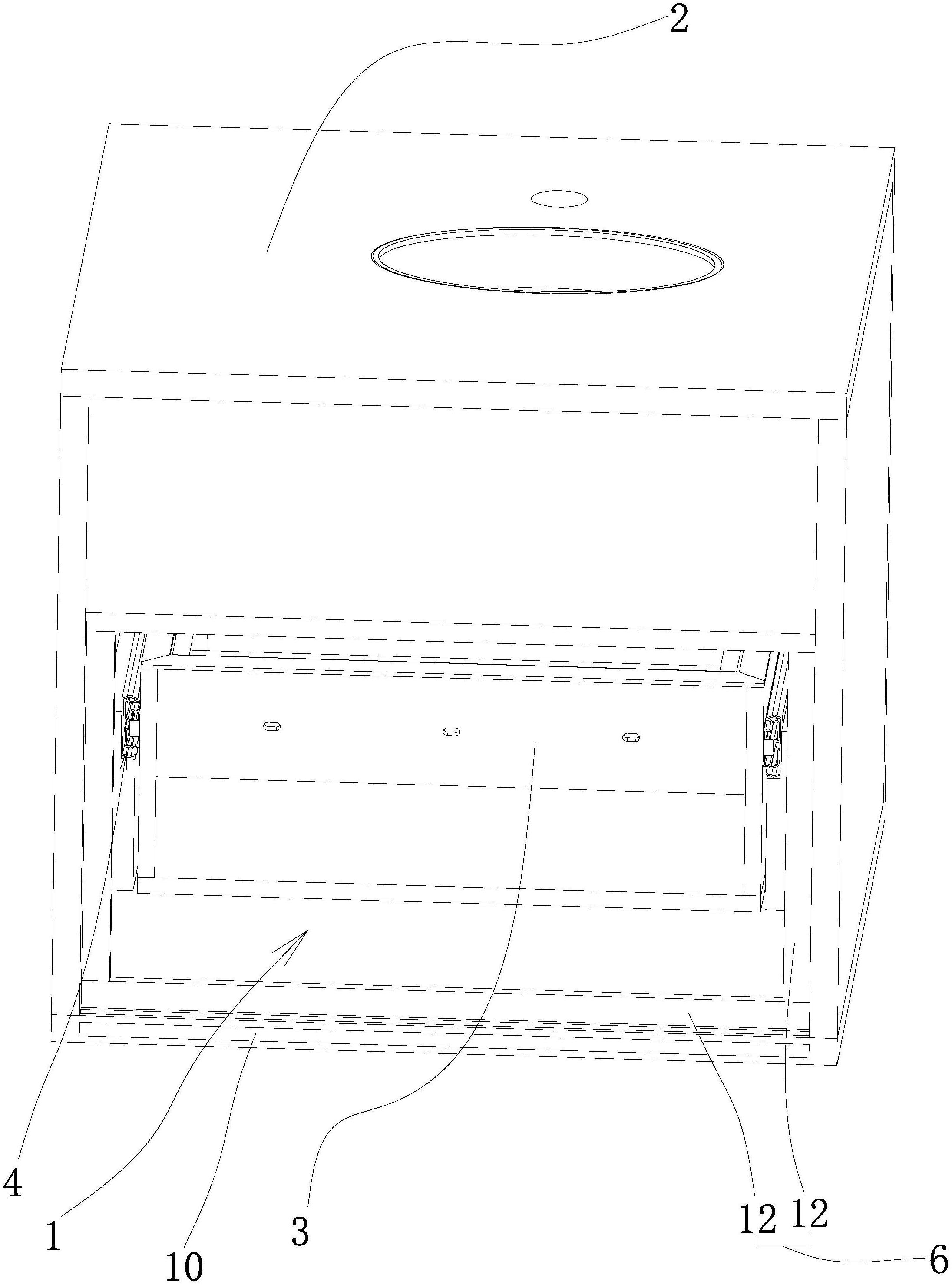 本实用新型提供了一种防渗水浴室柜,属于卫浴用品技术领域。它解决了现有浴室柜容易进水造成细菌滋生的问题。本防渗水浴室柜包括带有储物腔的柜体,柜体位于储物腔内设置有用于存放卫浴用品且可滑动拉出的抽屉,柜体位于储物腔内还设置有便于抽屉拉出的两个滑动单元,抽屉的前端面上设置有用于密封储物腔且便于抽屉拉出的前盖板,柜体位于储物腔内还设置有与柜体相固连且与前盖板相配合的板架组件,前盖板由前板和后板组成,前板和后板之间设置有两端分别与前板和后板相固连且用于导向渗水流向的导流单元,柜体中的底板上开设有与导流单元相配合的排水口。本实用新型具有通过柜体连接处密封性且减少渗水进入的优点。