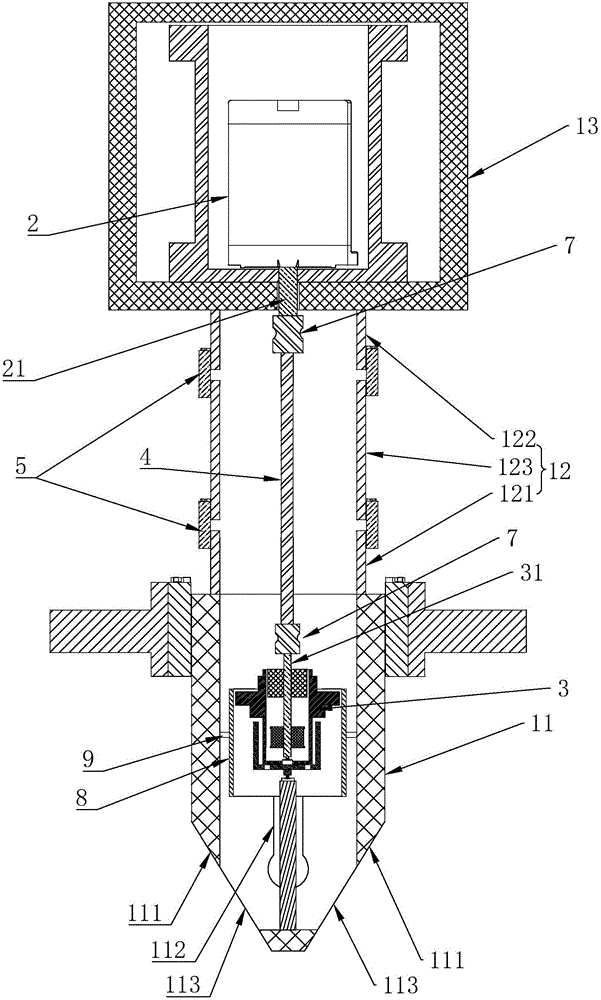 一种长度可调节的旋转式在线粘度计,包括外壳,外壳包括外壳前端、外壳尾端和外壳中段,外壳中段焊接于外壳前端、外壳尾端的中间,且外壳前端、外壳中段、外壳尾端内部相通,外壳尾端内部设有步进电机,步进电机的驱动轴伸入外壳中段内,外壳前端内设有测矩装置,测距装置内伸出一根与所述驱动轴同轴的旋转轴,所述外壳中段包括一端固定于外壳前端端部的壳体一,还包括一端固定于外壳尾端端部的壳体二,壳体一与壳体二之间可拆卸地固定有壳体三;所述驱动轴与旋转轴之间可拆卸地固定有一根中间轴。本实用新型的目的在于提供一种长度可调节的旋转式在线粘度计,具有方便更换壳体部件、联轴部件以调节长度的优点。