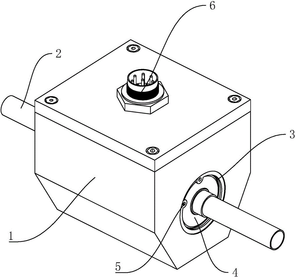 本实用新型公开了一种扭矩传感器,旨在提供一种具有对转轴旋转干扰少的优点的扭矩传感器,其技术方案要点是,所述轴承与外壳之间设有垫圈,垫圈的内径大于轴承的内径,外壳上设置有若干个呈圆环状的卡环,卡环朝向转轴方向凸出并且抵接在垫圈上,垫圈能减少轴承旋转时外壳对轴承和转轴的干扰,还能对轴承起到密封作用,防止润滑油流出和灰尘的进入,增加扭矩测量的准确性,同时卡环代替了端盖,将垫圈、轴承和转轴的位置相对固定,卡环的面积较小,不会对转轴的旋转产生干扰,可以进一步提升扭矩传感器测量的准确性。