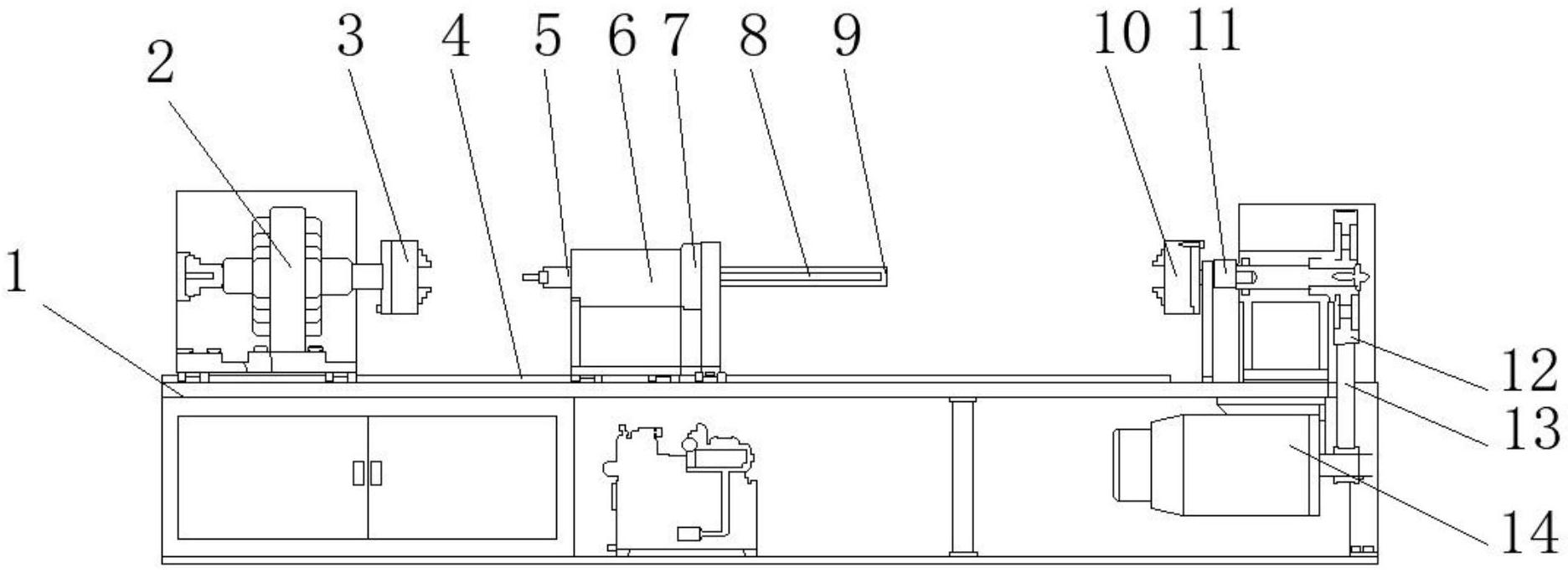 本实用新型公开了锚杆锚固旋转搅拌轴力扭力疲劳循环伺服试验机,包括工作台架,所述工作台架的顶面设有直线导轨,所述直线导轨的一端位置螺栓连接有电磁离合器,所述电磁离合器的内侧一端安装有三爪卡盘一,所述直线导轨的顶面对应电磁离合器的一侧设有穿心式油缸,所述穿心式油缸对应电磁离合器的一端安装有锚杆锚具,所述穿心式油缸的另一端设有负荷传感器,所述负荷传感器远离穿心式油缸的一端连接有钢管,所述钢管的外侧嵌套有锚杆组件。本实用新型转驱动及其传动部分以及轴向加载油缸都通过直线导轨安装在工作台上部,使其结构紧凑、操作方便,保证设备的利用率高,节约了能源损耗。