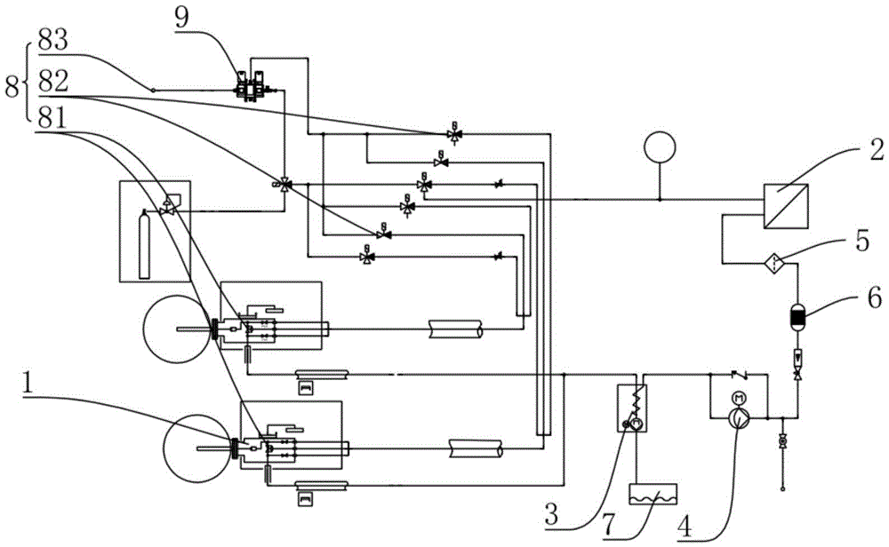 本实用新型公开了一种冷干式船舶废气在线监测系统,包括探头、分析仪和取样管线;探头与分析仪之间依次设置有具有冷凝功能的压机和采样泵以及除水器;采样泵工作,探头采集烟气,烟气经压机冷凝去除烟气中的水分,去除水分的烟气经采样泵进入除水器进一步出水,最后进入分析仪进行烟气成分分析并经分析仪排出,采用湿法监测代替热法监测,湿法监测对保温措施降低,降低了设备的成本;同时该系统能够通过切换探头的开闭以控制不同采样点的烟气采集,且共用一个采样泵,减少了设备的冗余,并节省了占地面积和设备成本。