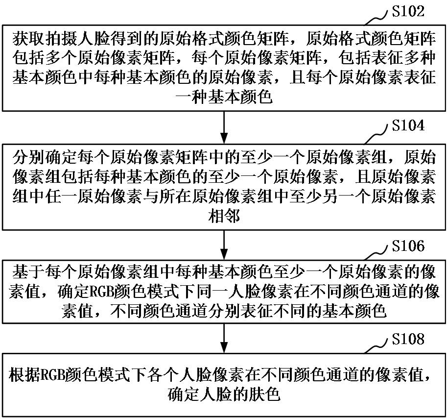 本申请涉及一种肤色检测方法、装置、计算机设备和存储介质。所述方法包括:获取拍摄人脸得到的原始格式颜色矩阵;分别确定每个原始像素矩阵中的至少一个原始像素组,原始像素组包括每种基本颜色的至少一个原始像素,且原始像素组中任一原始像素与所在原始像素组中至少另一个原始像素相邻;基于每个原始像素组中每种基本颜色至少一个原始像素的像素值,确定RGB颜色模式下同一人脸像素在不同颜色通道的像素值,不同颜色通道分别表征不同的基本颜色;根据RGB颜色模式下各个人脸像素在不同颜色通道的像素值,确定人脸的肤色。采用本方法能够提高检测的肤色的准确度。