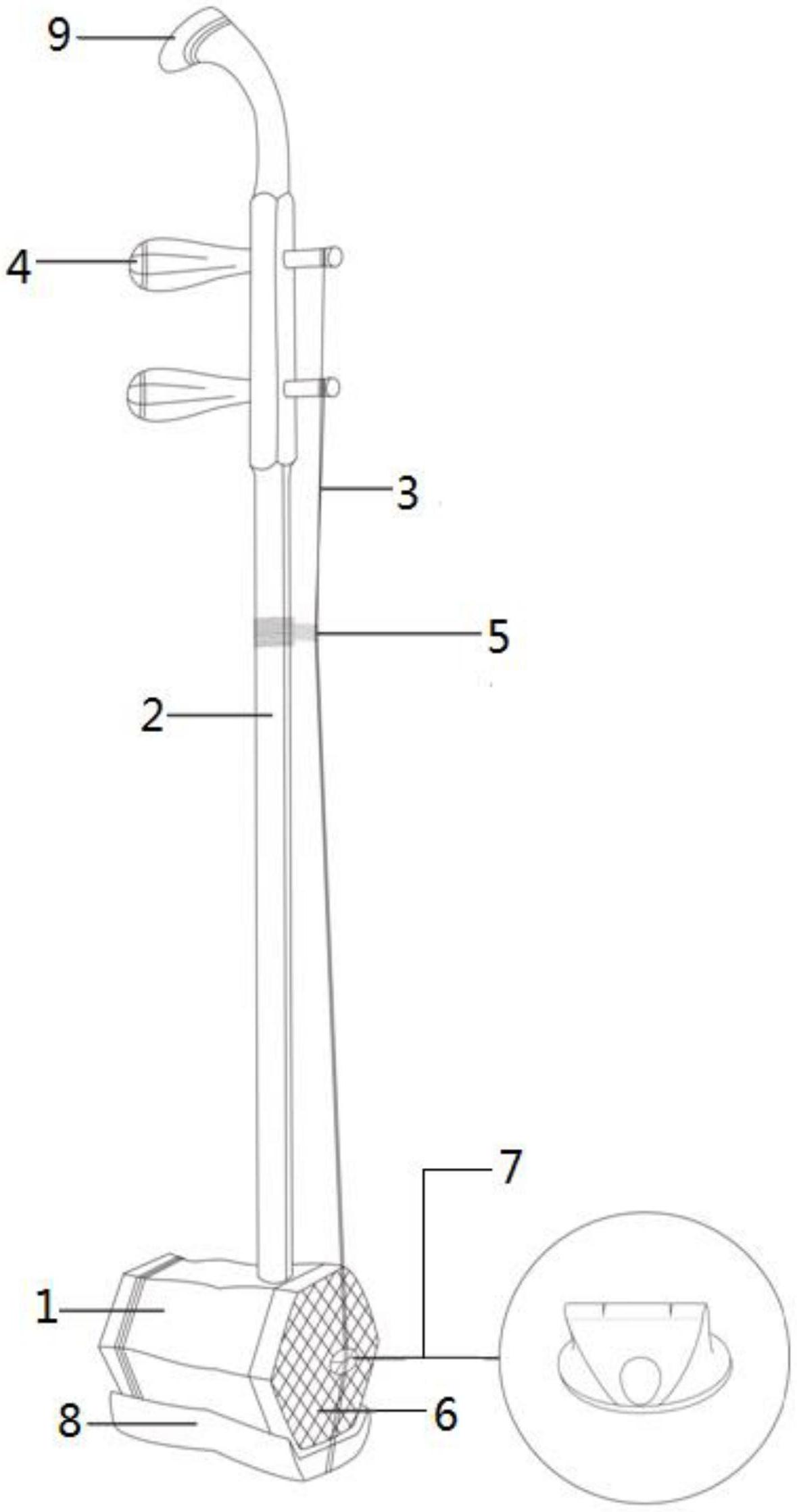本实用新型涉及拉弦乐器的技术领域,特别是涉及一种适用儿童的二胡;包括琴筒、琴杆和琴弦,琴筒的长度为124mm,琴筒的后口直径为73mm,琴杆的底端与琴筒连接,并在琴杆上设置有琴轴,下方琴轴的中心与琴筒上沿的长度为370mm,琴杆上设置有对琴弦进行固定的千斤,千斤的宽度为18mm;根据儿童身体比例,在成人二胡基础上根据黄金比例进行改进,避免儿童使用成人二胡造成手型、演奏姿势、演奏技巧不标准的情况。