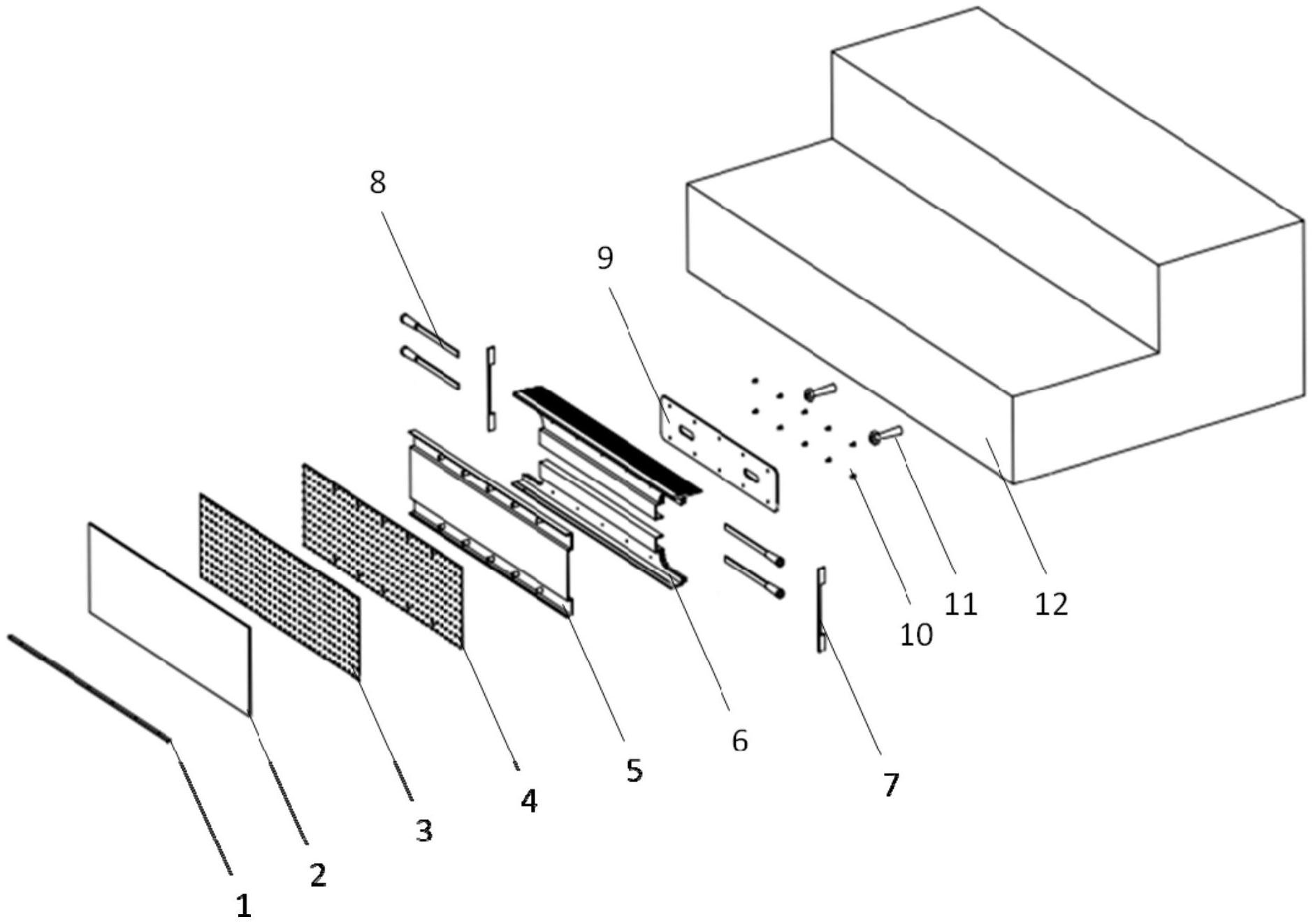 本实用新型公开一种楼梯显示屏,包括显示屏模组、覆盖在显示屏模组外表面的透明板、将显示屏模组固定在楼梯立面的安装底座,每一所述楼梯立面安装若干个显示屏模组。本实用新型通过增加透明板实现防脚踢,来避免脚对灯珠的损坏;通过硅胶导热条有效解决了灯珠散热的问题;且设计成单元模块,采用外置电源,不仅有效减小厚度、增加美观度而且有效防止电源散热对显示屏的损坏。