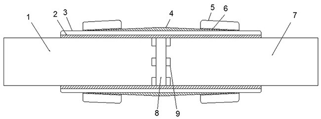 本实用新型公开了一种卡扣式钢筋连接器,包括第一钢筋、第二钢筋及壳体,其特征在于,第一钢筋的一端与壳体的内部一侧活动连接,第二钢筋的一端与壳体的内部另一侧活动连接,壳体的中间部位安装有隔板,隔板的四周分别与壳体的内壁固定连接,隔板的两侧分别设有限位凸块,限位凸块与隔板固定连接,壳体的内壁四周分别与防滑纹理固定连接,壳体的外侧四周设有斜边凸块,斜边凸块的内侧与壳体固定连接,斜边凸块的两侧分别安装有螺套,螺套的内壁分别安装有螺纹,第一钢筋及第二钢筋的相对侧分别设有凹槽,且凹槽与限位凸块嵌合连接,斜边凸块的两侧分别设有外层螺纹,且外层螺纹与螺套螺纹连接。本实用新型结构简单,操作方便。