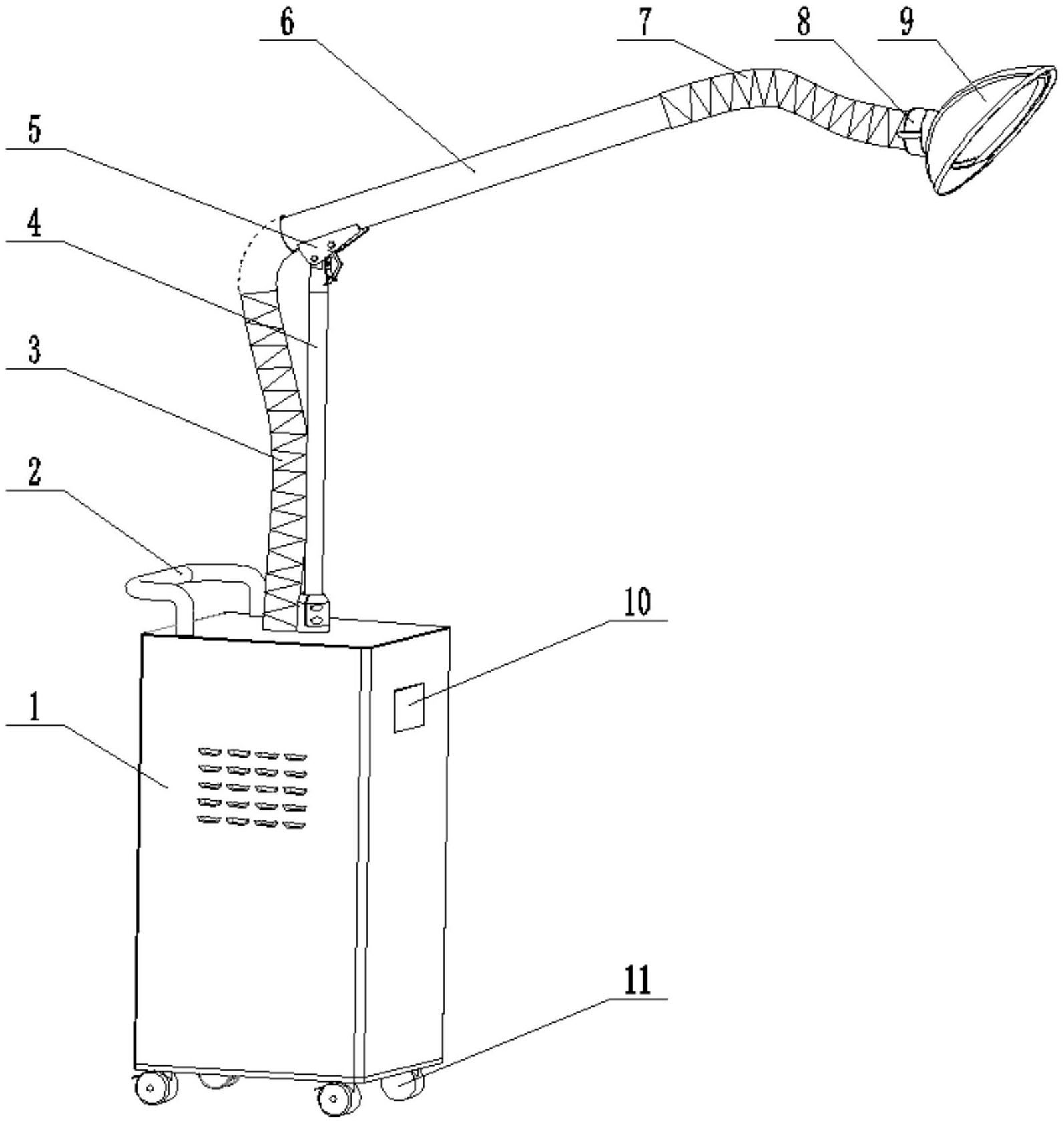 本实用新型涉及的一种牙科负压气雾消毒机,包括主机壳,所述主机壳向上装有立撑管,所述立撑管顶部设置有平衡万向节装置,所述平衡万向节装置上设置有硬臂管,硬臂管的后端通过一个弯头密封连接有向下的后软管,所述后软管的下端从主机壳的顶部伸入主机壳内,硬臂管的前端密封连接有前软管,所述前软管的前端连接有气雾收集罩,所述主机壳内的中段设置有从上至下依次布置的紫外线灯管、初效网、高效滤网以及涡轮风机。本实用新型一种牙科负压气雾消毒机,能对牙科病人治疗时产生的大量气溶胶及病人呼出的气体,进行快速收集隔离并进行动态、安全、彻底消毒净化处理,具有及时便捷且安全高效的优点。