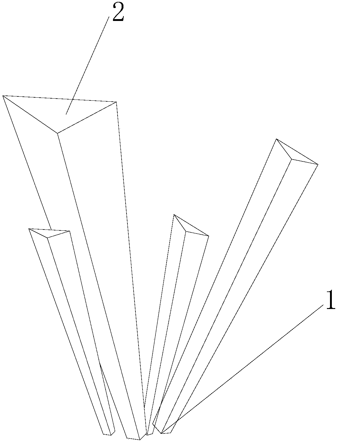 本实用新型公开了一种等腰三角形人工草丝,包括多片挤出型单丝;多片挤出型单丝的底部连接形成一束草丝;每片挤出型单丝包括人工草丝本体;所述人工草丝本体的横截面为等腰三角形;且横截面为等腰三角形的表面还设置有表面凸起部;且所述凸起部为半球形形状,多个所述凸起部呈矩阵阵列方式排列在所述人工草丝本体的表面上。本实用新型提供的等腰三角形人工草丝,提升了人工草坪的耐磨性、抗磨损性能和回弹性以及直立性能,具有诸多方面的技术优势。