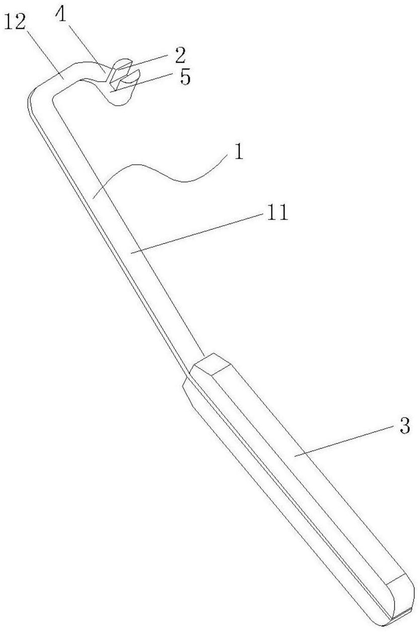 本实用新型涉及一种钢琴击弦机勺钉的调试工具,用于调试勺钉与制音杆间距,其包括J型连杆,所述J型连杆的勾部末端设有卡槽,所述卡槽垂直J型连杆的长杆,卡槽的槽宽度大于所述勺钉直径,采用以上技术方案可直接调节勺钉与制音杆间距。