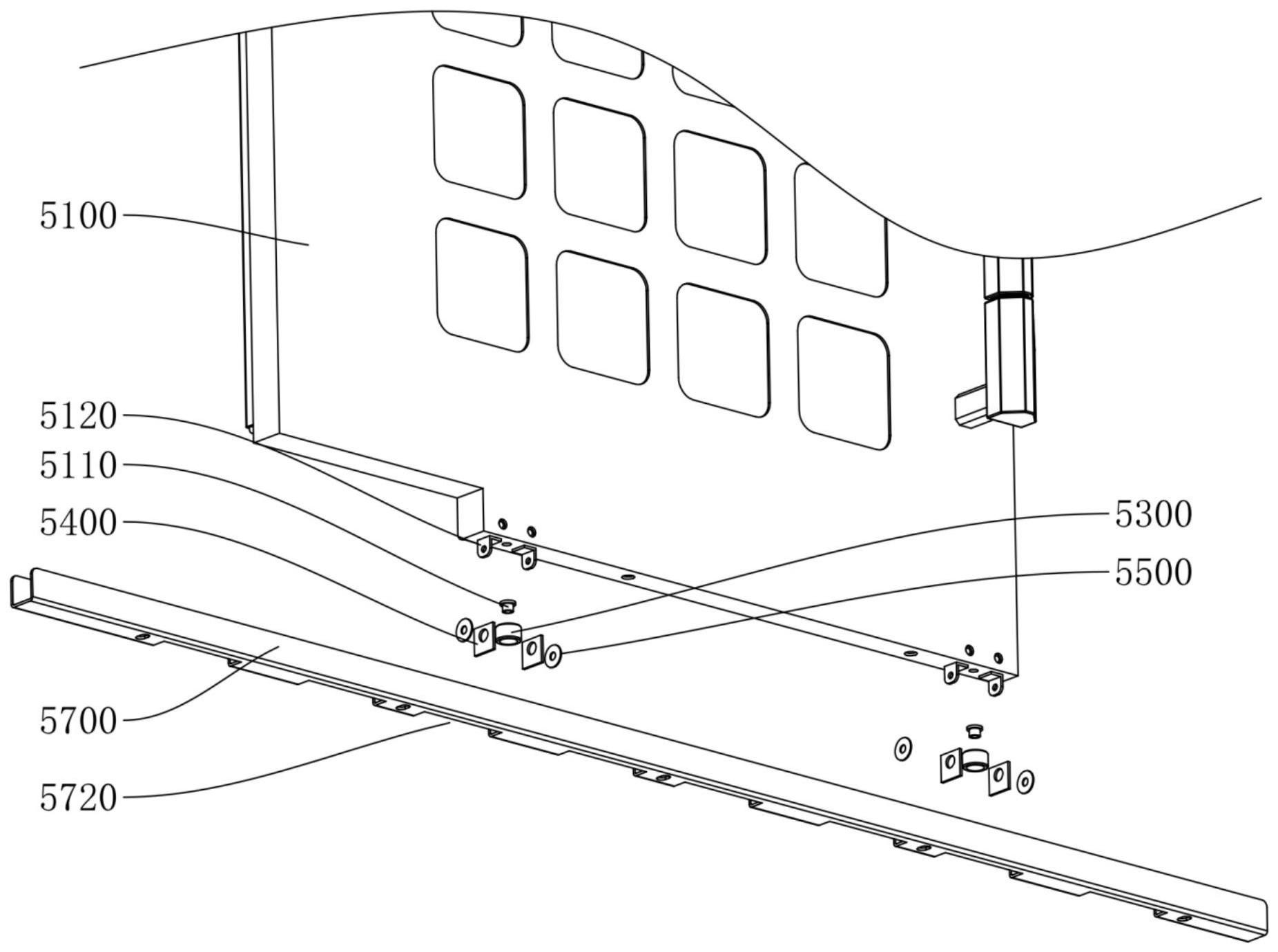 本实用新型涉及一种机床的门轨组件,包括设置在防护壳上的第二平移导轨,第二平移导轨上设置有导槽;滑动设置在防护壳上的第一防护门,第一防护门的底部设于导槽内;设置在第一防护门底部的软胶刮片,软胶刮片的延伸方向基本相交于导槽的延伸方向,软胶刮片的至少部分边缘与导槽的两侧壁过盈配合。设在第一防护门的底部的软胶刮片,通过边缘和导槽两侧壁的过盈配合,使第一防护门的底部避免和导槽直接接触,通过软胶刮片的弹性过滤和吸收从防护壳上传递的震动,避免第一防护门在导槽内震动并产生异响,在启闭第一防护门时,软胶刮片还将落入导槽内的碎屑和切削液刮离导槽,保持导槽的整洁,避免碎屑阻塞在导槽和第一防护门之间。