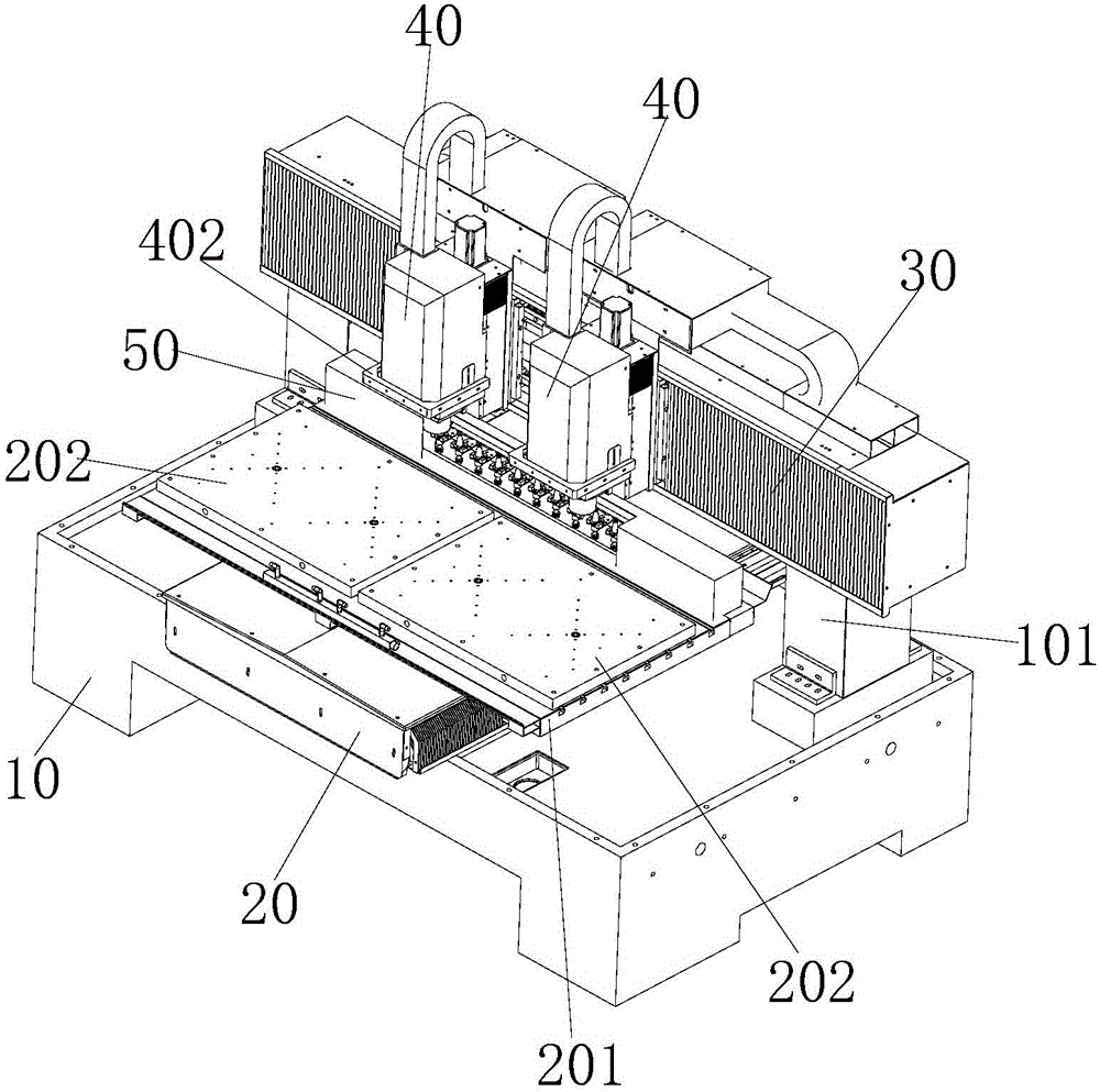 本实用新型公开了一种带有刀库的数控精雕机,涉及数控机床技术领域;包括机床底座、Y轴运动模组、X轴运动模组以及Z轴运动模组;所述的Y轴运动模组固定在机床底座上方,Y轴运动模组上设置有工作平台,且工作平台上方并排设置有两个定位治具;所述的X轴运动模组设置在定位治具上方,且X轴运动模组上并排设置有两个Z轴运动模组,每个Z轴运动模组下方均安装有机床主轴加工组件;所述的工作平台上还设置有刀库组件,且该刀库组件位于定位治具的后方;所述的刀库组件包括刀卡定板、刀库弹片、刀夹、气缸、刀库防护罩以及刀库门;本实用新型的有益效果是:该数控精雕机的刀库组件的安装空间小、刀具多,换刀速度快。